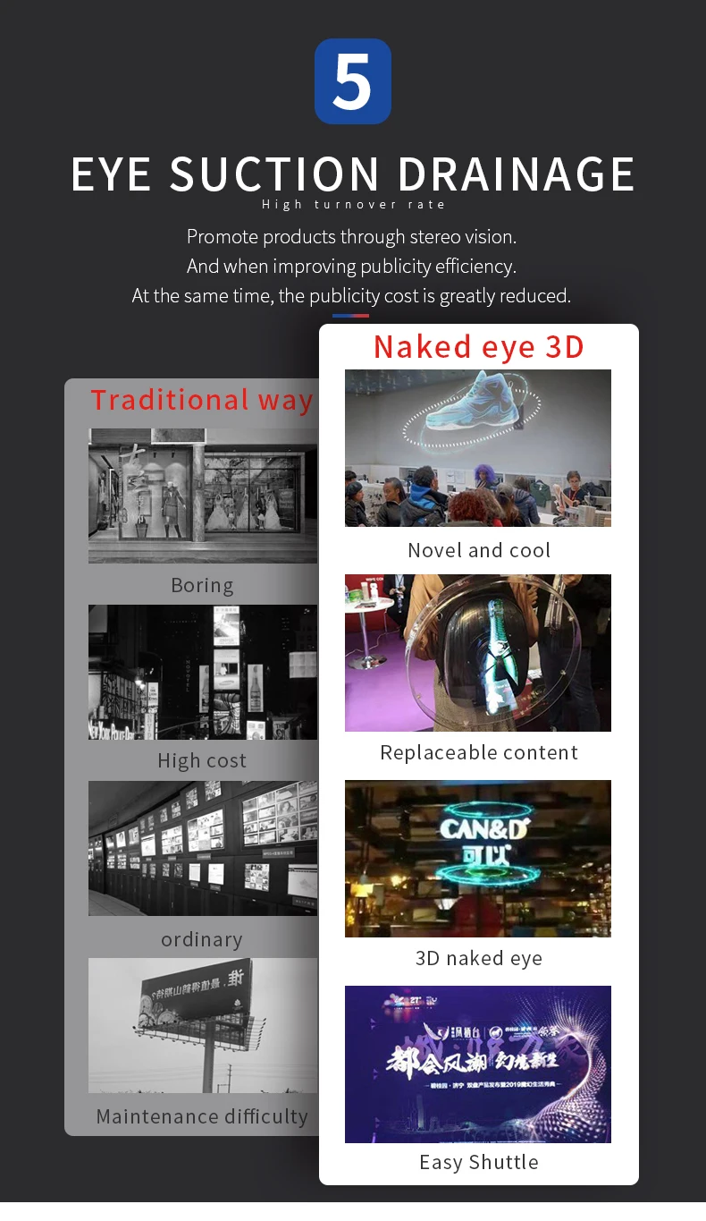 1 Promote products through stereo vision. 2 Improve the efficiency of publicity.3 At the same time, the cost of publicity is greatly reduced.