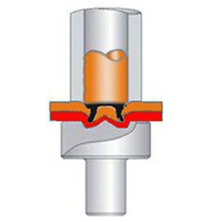 The pressure nozzle first moves downward to pre-press the rivet material to prevent the rivet material from flowing into the mold under the action of the rivet, and then the punch moves downward to push the rivet out of the material.