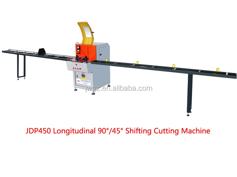 JDP450 Longitudinal 90°/45° Shifting Cutting Machine is the model suitable for cutting Aluminum alloy profile in both 45° and 90°. It has the features of angle precision, stable structure, and wide application on cutting 45°and 90° in various door and window profile. The current model has already included a set of feeding racks, 3 meter on each side of the machine, which is long enough to carry a regular 6 meter profile.
