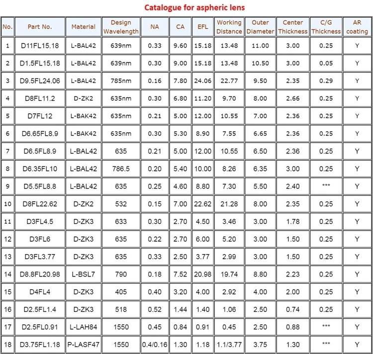 Aspheric Lens are used to eliminate spherical aberration in a range of applications, including bar code scanners, laser diode collimation, or OEM or R&D integration. Aspheric lenses utilize a single element design which helps minimize the number of lenses found in multi-lens optical assemblies. Said another way, unlike conventional lenses with a spherical front surface, aspheric lenses have a more complex front surface that gradually changes in curvature from the center of the lens out of the edge of the lens. This reduction in total element count not only helps decrease system size or weight, but also simplifies the assembly process. Integrating aspheres into an application such as focusing the output of a laser diode may not only decrease total cost, but may also outperform assemblies designed with traditional spherical optical lenses.