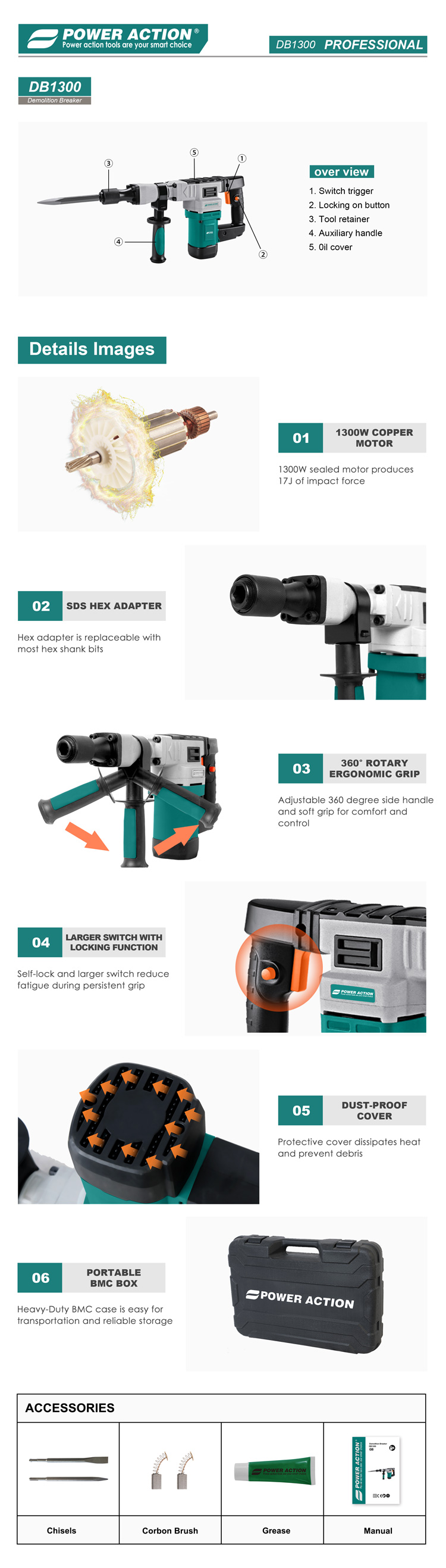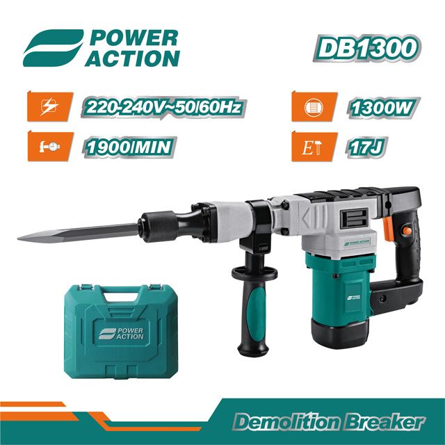 The Power Action Demolition Breaker DB1300 delivers 17 Joules of heavy-duty impact energy with a solid 1300 watt motor that spins at 1900RPM.