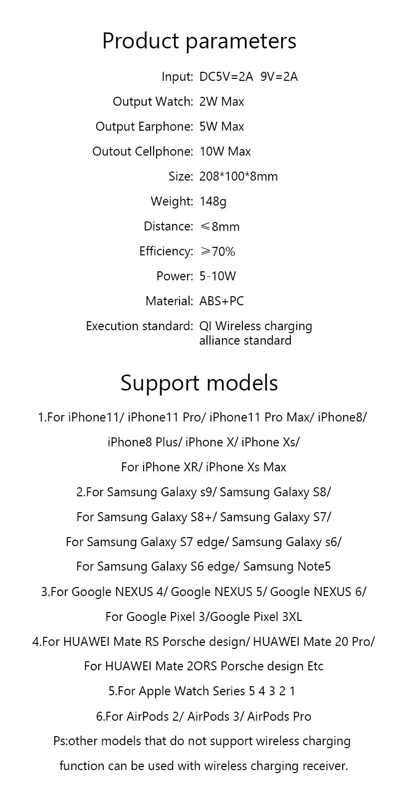 supporting device: | All QI wireless charging standard equipment. Suitable for all kinds of mobile phones and phones |