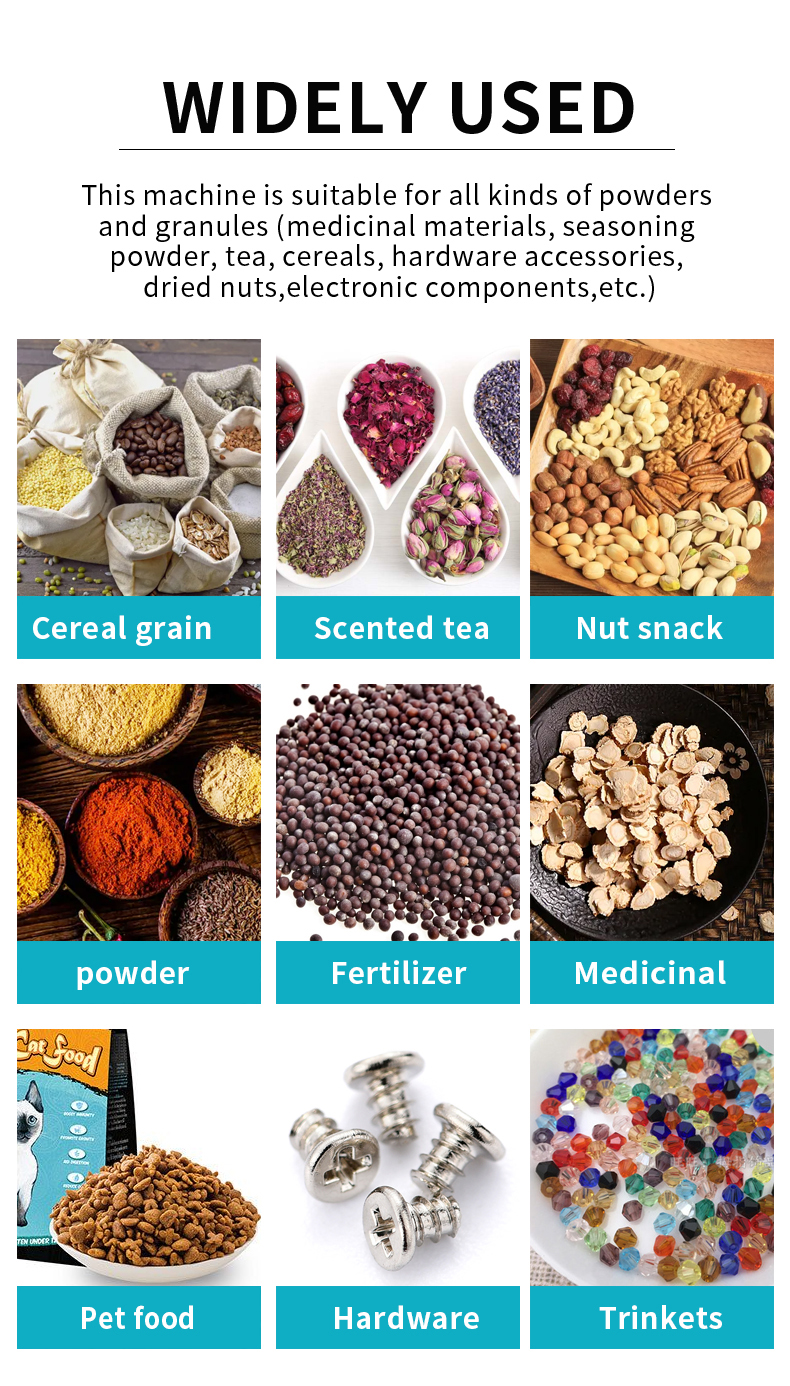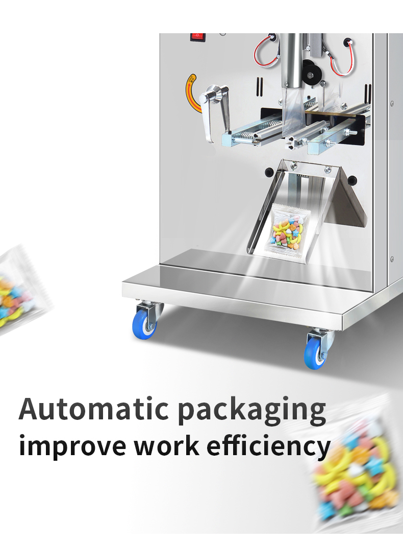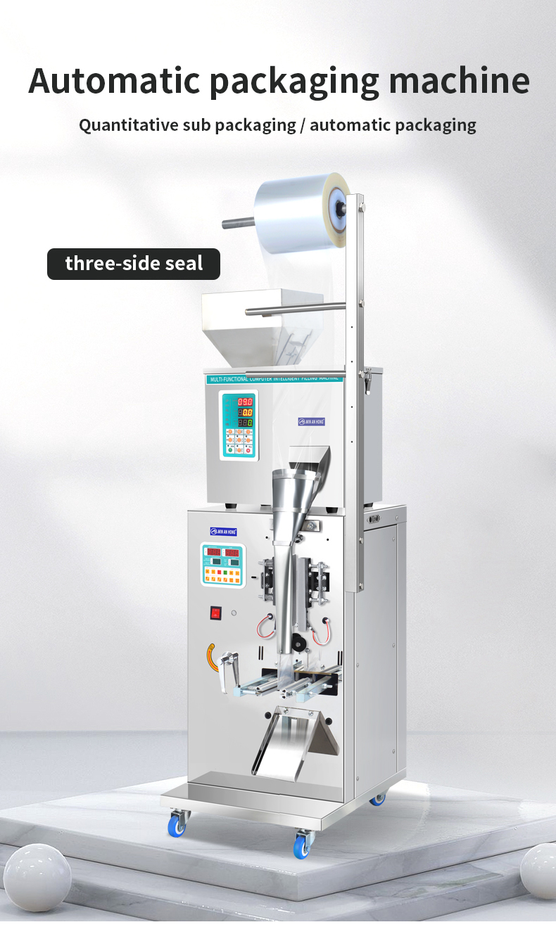 The automatic granule packaging machine is made of stainless steel, with stable performance, low consumption, high efficiency, safety and cleanliness. It is an ideal equipment for packaging food, tea, medicinal materials, dry powder, granules, seeds, grain, wheat, etc. , beans, small hardware and components, etc.