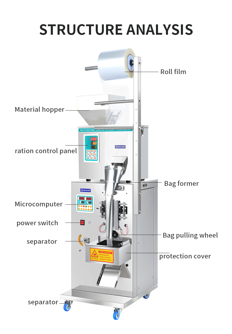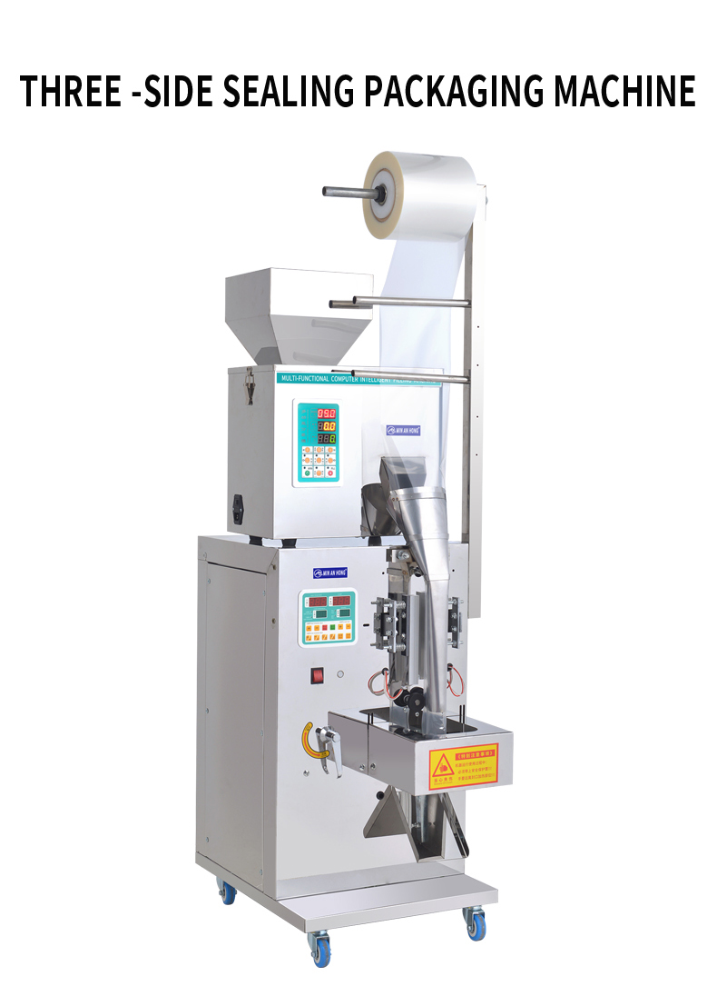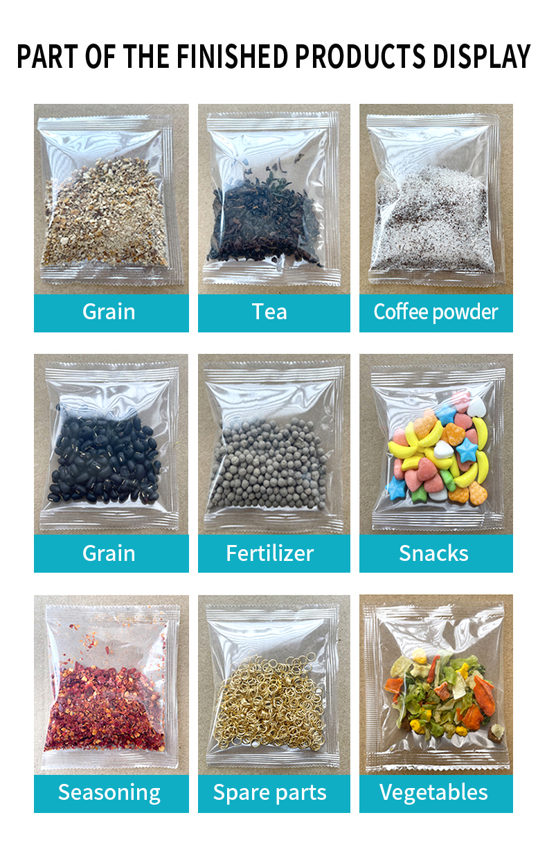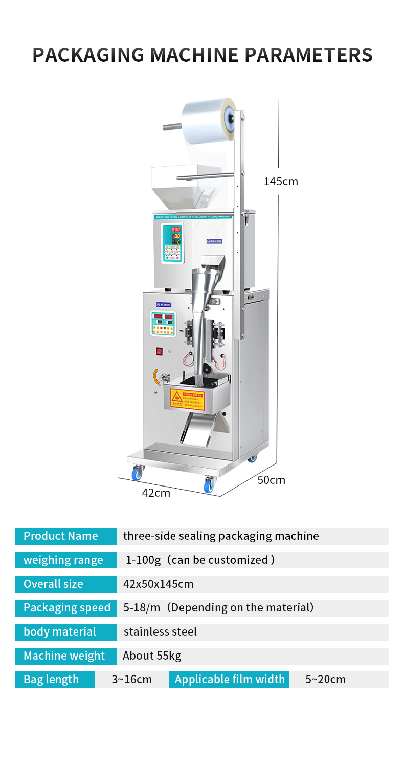 The automatic granule packaging machine is made of stainless steel, with stable performance, low consumption, high efficiency, safety and cleanliness. It is an ideal equipment for packaging food, tea, medicinal materials, dry powder, granules, seeds, grain, wheat, etc. , beans, small hardware and components, etc.