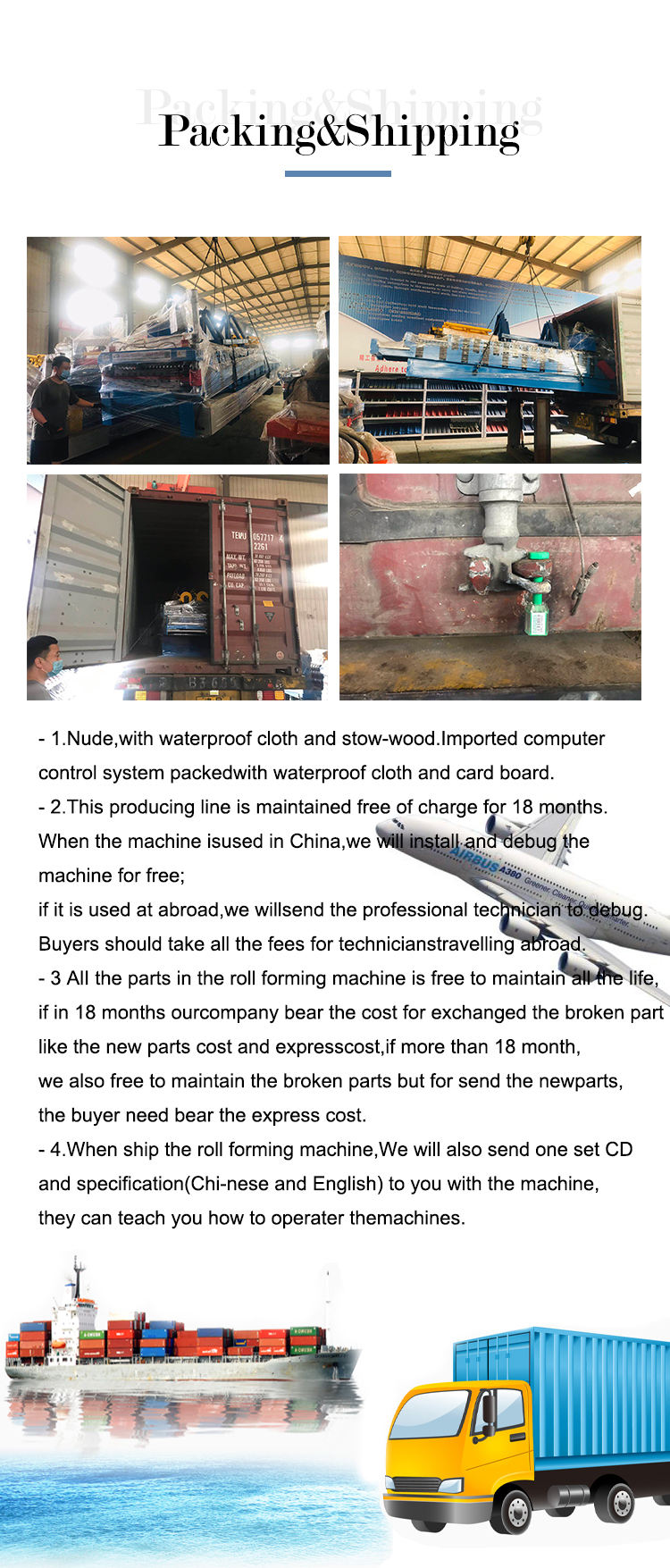 | Showroom location: | Canada, Turkey, United States, Germany, Philippines, Brazil, Peru, Indonesia, Mexico, Spain, Morocco, Kenya, Chile, Colombia, Algeria, Sri Lanka, South Africa, Nigeria, Australia | Packaging Details: | 1. A 40-foot container is required; 2. Suitable for sea transportation; 3. The main body of the roll forming machine will be packed into the container naked and covered with plastic film. 4. Fix the machine inside the container with steel wires to prevent damage when shaking at sea. 5. Spare parts will be packed into cartons. 6. The receipt form is put into the carton. 7. Manual uncoiler bare bag |