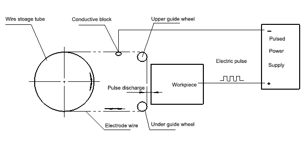 Wire EDM, the electrode wire and the workpiece between the pulse discharge, as shown in Figure 1. When an electrical pulse to the time between the wire electrode and the workpiece to generate a spark discharge in the center of the discharge channel, the instantaneous temperature up to 10000℃, high temperature molten metal workpiece, so as to achieve the purpose of cutting metal