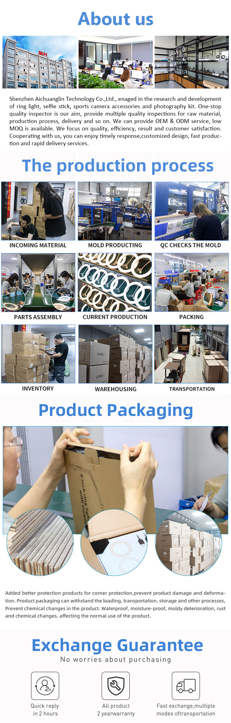 Q1: Are you a manufacturer or a trading company?A: We are a professional manufacturer of selfie sticks, tripods and action camera accessories in Shenzhen.Q2: How do you control the quality?A: Aichuanglin has a reliable and strict quality control system, 100% aging test before packaging. Third party inspection is also acceptable.Q3. Can you customize the logo and package?A: Yes, OEM/ODM/RTS is acceptable. MOQ=1PCS. Our design team will help you design according to your requirements.Q4: When will the goods be shipped?A: We have enough stock to ship within 48 hours, we usually ship by Ali-Logistics, DHL, UPS, Fedex, TNT, EMS, SF Express or your designated forwarder.Q5: How to place an order?A: "Start ordering" "Select quantity, color" "Fill in your address" (remember to enter your phone number and zip code)" or you can "send inquiry" to us, we will reply quickly within 2 hours during working time .