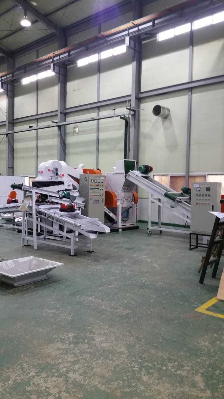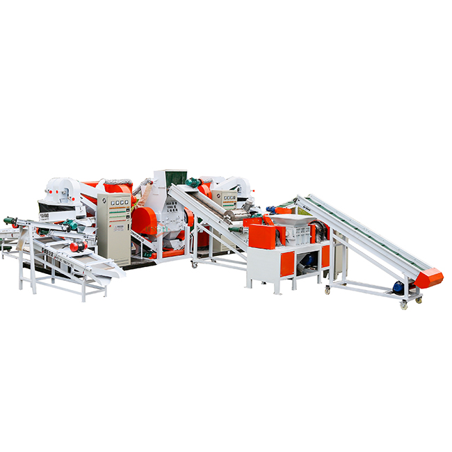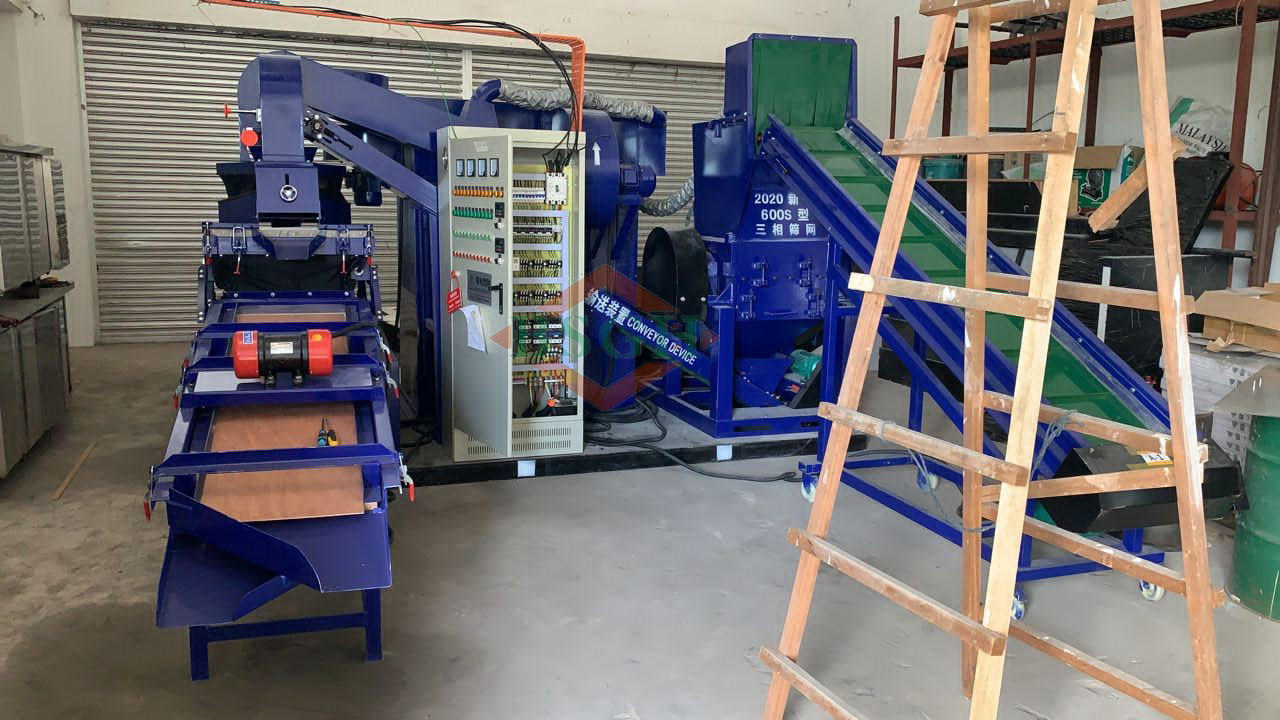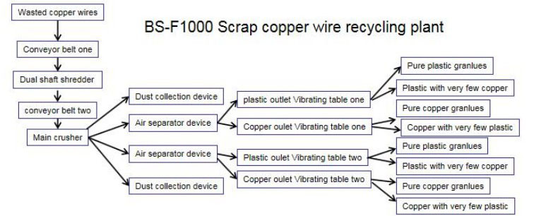 in principle:Due to the different densities of plastic and copper, the crusher needs to process the plastic first, and then separate it through a vibrator and an air separator together. Finally the copper comes out the front side and the plastic comes out the other side.