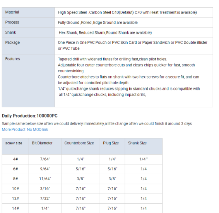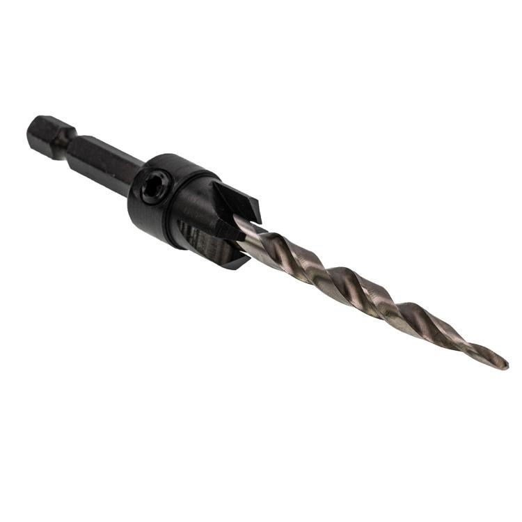 Top Material Components, Durable: Tapered Drill HSS M2, by far the most popular high speed steel for high toughness, wear resistance and good edge retention; 4 knives #45 carbon steel; #6 countersink , with 9/64" tapered flute drill HSS M2; Drills, countersinks and countersinks in 1 step; Countersink does not clog, provides excellent speed and clean surfaces