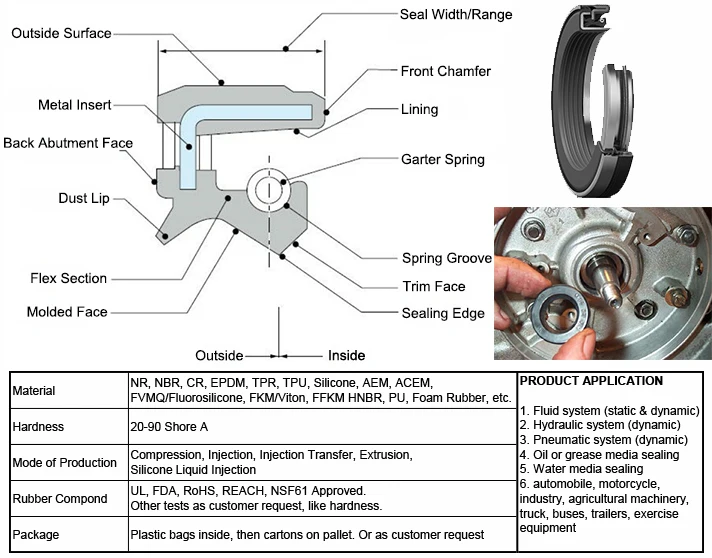 | Application | Fluid system, Hydraulic system, Pneumatic system, Oil or grease media sealing, Water media sealing, etc. |