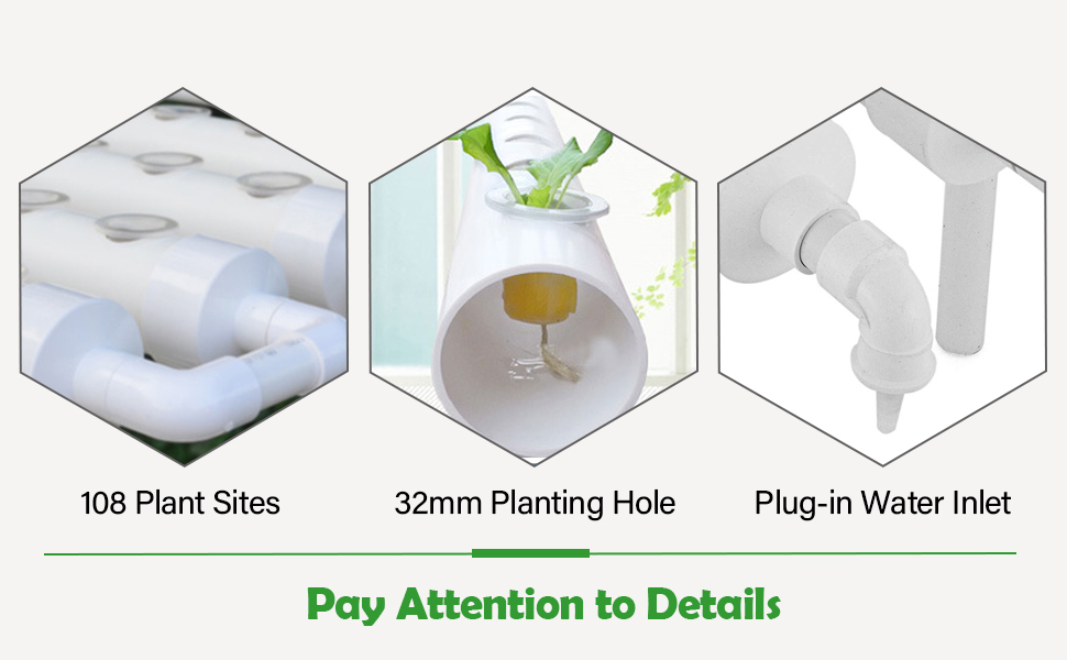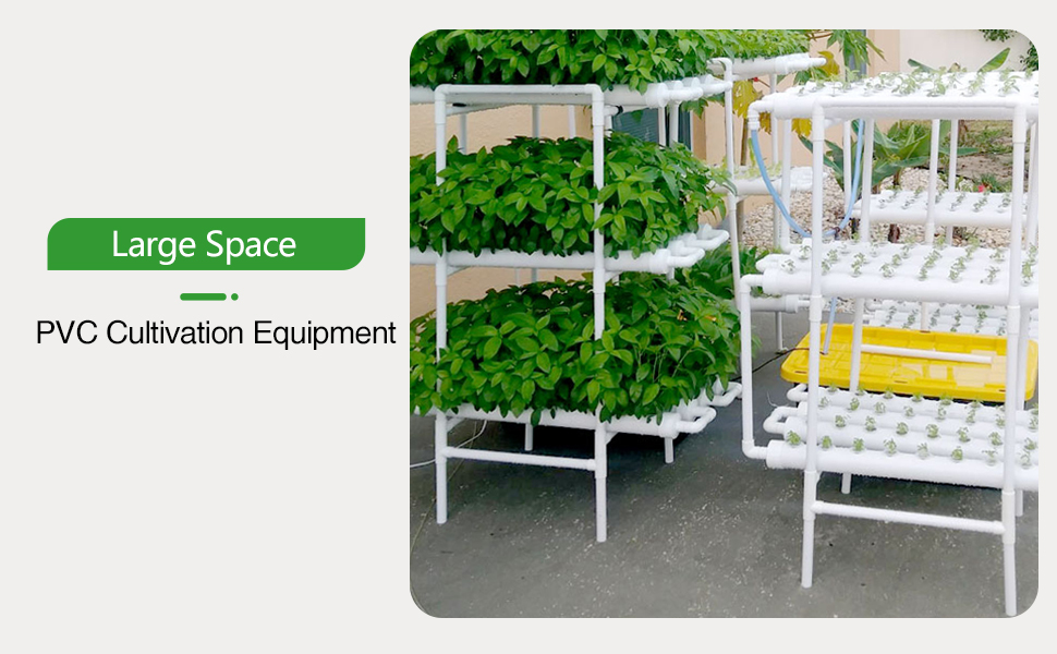 Each food-grade PVC-U pipe is 2.5 inches (6.3 cm) in diameter and has 108 positions for vegetables, flowers and plants; Indoor and outdoor PVC hydroponic growing system kit is especially suitable for home and office leafy vegetables, Such as lettuce, celery, beets, bell peppers, garlic sprouts, rapeseed, etc.