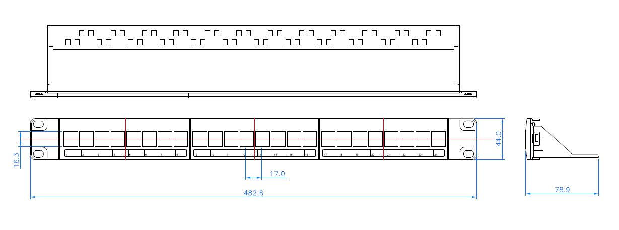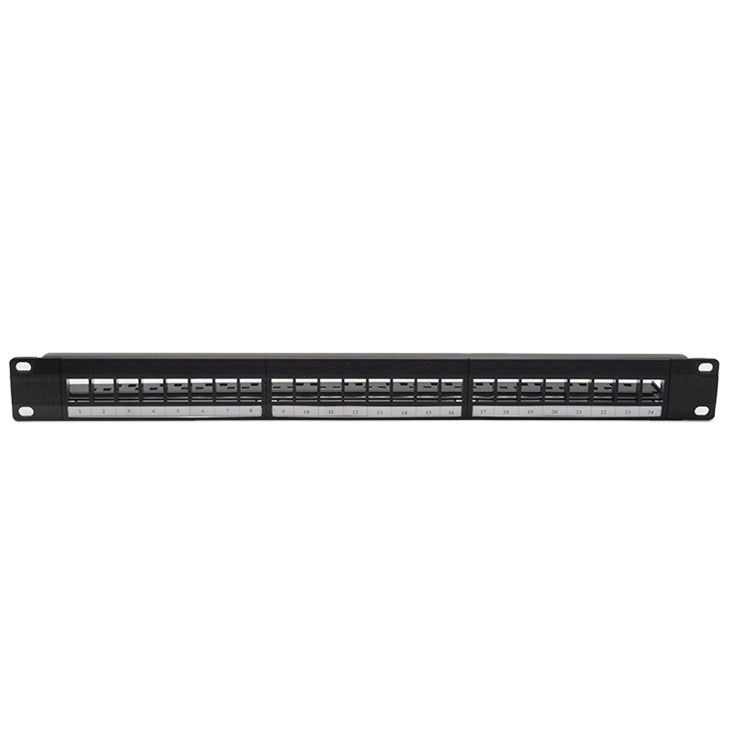 Blank patch panels can be assembled with all standard modular jacks. Panel with ABS frame, SPCC base and back bar. It can be fully loaded with 24 keystone jacks. Mounts in a standard 19" rack or cabinet for better connectivity