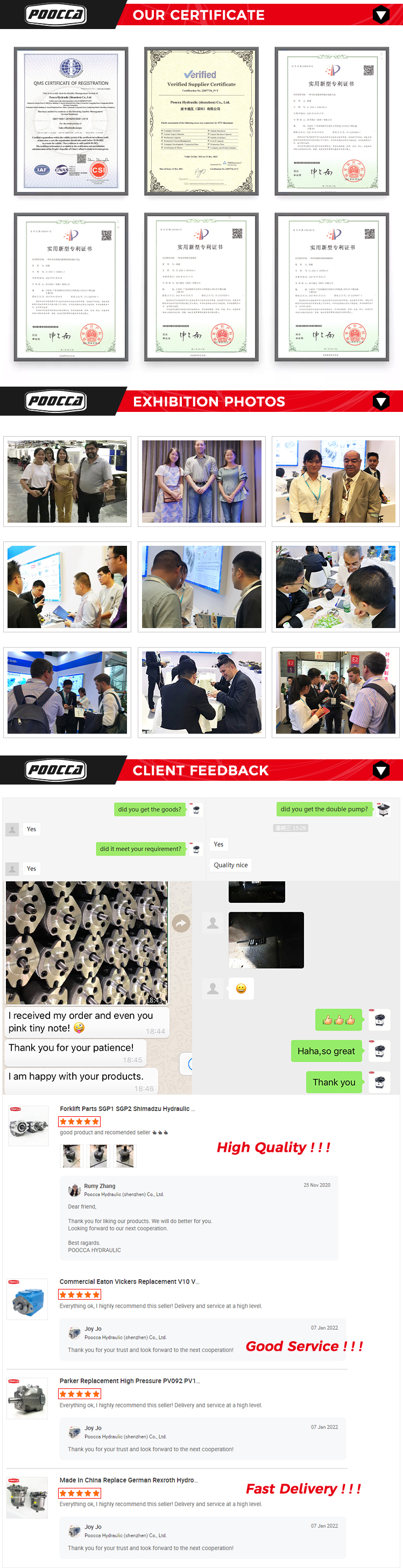 Q1. What is your main application--Construction Machinery--Industrial Vehicles--Sanitation Equipment--New Energy--Industrial Applications.Q2. What is the MOQ--MOQ1pcs.Q3. Can I mark my own brand on the pump- Yes. Complete orders can be marked with your brand and code.Q4. How long is your delivery time--Generally it is 2-3 days if the goods are in stock. Or it is 7-15 days. If the goods are not in stock, it will be calculated by quantity.Q5. What payment methods are accepted--TT, LC, Western Union, Trade Assurance, VISAQ6. How to place an order1). Tell us the model, quantity and other special requirements. 2). Proforma Invoice will be made and sent to you for approval. 3). After receiving your agreement and payment or deposit, we will arrange the production. 4). The goods will be delivered as specified on the proforma invoice.Q7. What kind of inspection can you providePOOCCA is tested multiple times by different departments such as QA, QC, sales representatives from material purchase to finished products to ensure that all pumps are in perfect condition before shipment. We also accept inspection by the third party you appoint.