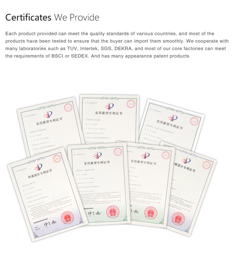 Every product provided can meet the quality standards of various countries, and most of the products have been tested to ensure smooth import for buyers. We cooperate with many laboratories such as TUV, Intertek, SGS, DEKRA, and most of our core factories can meet the requirements of BSCI or SEDEX. And has a number of appearance patent products