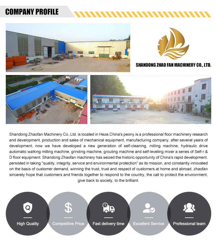 Shandong Zhaofan Machinery Co., Ltd. is located in Heze, the peony capital of China. It is a mechanical equipment manufacturing company specializing in the research, development, production and sales of floor machinery. We have a range of concrete floor surface preparation machines such as concrete floor sanders, floor scarifiers and consumable tools to meet the needs of ground preparation. We have relevant industrial vacuum cleaners for floor cleaning after concrete sanding. We are committed to providing the best machines and the best prices. We adhere to the principle of customer first and quality first, and provide dealers with one-stop purchasing, OEM and ODM services.