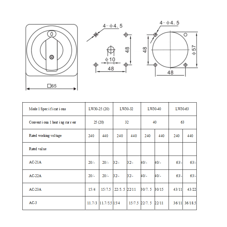 1. Product introduction LW30 series transfer switches are mainly used in circuits with AC 50Hz rated working voltage below 440V and rated current below 63A. They are used as the main switch of ventilation equipment, air conditioning and water pump systems, and can also directly control small-capacity AC motors. The product complies with the standards GB/T 14048.3 and IEC 60947-3. LW30 series switches have complete specifications, and the current levels are 20A, 25A, 32A, 40A, 63A. Lw30 series switches have the advantages of small size, compact structure, strict material selection, good insulation, finger protection function, safety and reliability, etc. Other contact blocks can be added to the 3-pole standard block without removing the switch. The insulation distance of Lw30 series switches is larger than other switches of the same type, and the disconnection speed is fast, which is suitable for DC switches. 2. Product Features (1) The ambient air temperature does not exceed +40°C. And the average temperature within 24 hours does not exceed +35C: (2) The lower limit of ambient air temperature does not exceed -25C; (3) The altitude of the installation site does not exceed 2000m; (4) When the highest temperature is +40°C, the relative humidity of the air does not exceed 50 %, higher relative humidity is allowed at lower temperatures, such as 90% at 20°C. Special measures should be taken for occasional condensation caused by temperature changes.