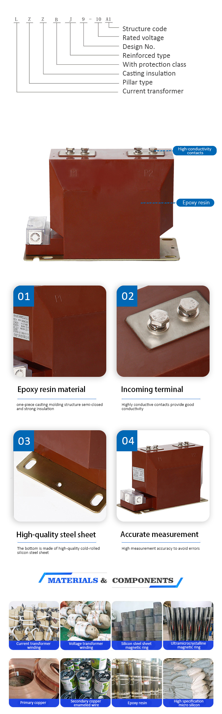 The current transformer is a column structure, usingEpoxy cast fully enclosed,Resistant to contamination and humidity, also suitable for tropical regions.Transformers do not require special maintenance, just regular removal of surface dirt.Fully enclosed due to current transformersEpoxy pouring.Small size and good quality.Suitable for any position and can be installed in any orientation.