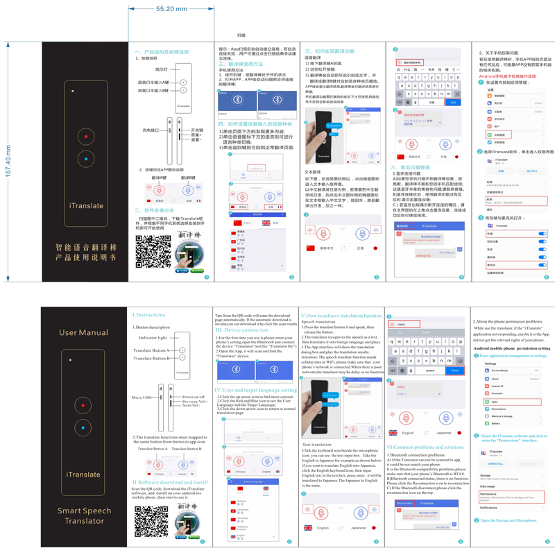 (1) Connect your mobile phone to Wifi or mobile network, scan the QR code on the product, and download the iTranslate translation APP;