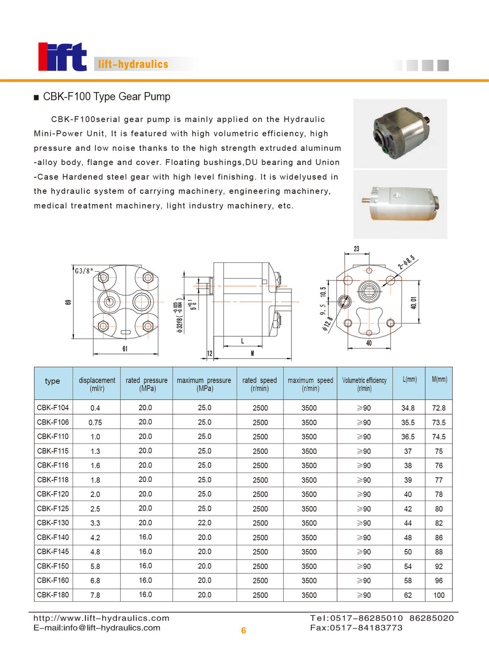 CBK high-quality small hydraulic gear pumps, CBK series gear pumps are mainly used in hydraulic micro power. High-strength extruded aluminum alloy pump body, flange and end cover are adopted, featuring high volumetric efficiency, high pressure and low noise. Floating bushings, DU bearings and header hardened steel gears with high level finishing. Widely used in hydraulic systems such as automobiles, construction machinery, medical machinery, and light industrial machinery.