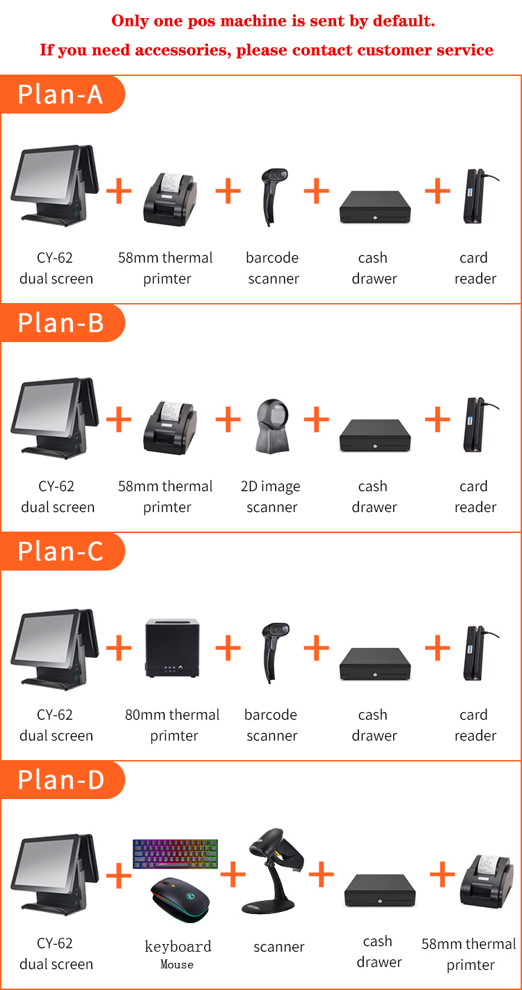 CY-62 pos machine is one of the best selling cash register, its screen is resistive. We are a pos system hardware machine source factory, so we can provide very cheap price and high quality, fast delivery through strict QC before sending for you. For single screen pos machine, we use A grade LED panel, LED8N customer display, we can also change to VFD (2 wires) for you, this touch machine is a great choice for you to open the pos terminal market and win more customers.