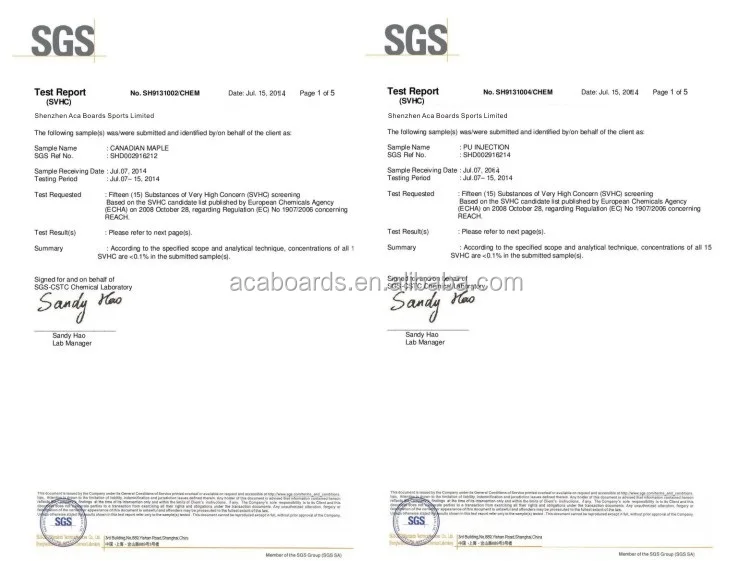 Aca boards have hi- tech equipments and modern administration, management under ISO9001: 2000, quality of our products controlled accordance with international standards(EC. ) we used cold press with high end technology equipments; Top class 100% Canadian Maple; U.S.type glue; Guarantee against delaminating and warping.