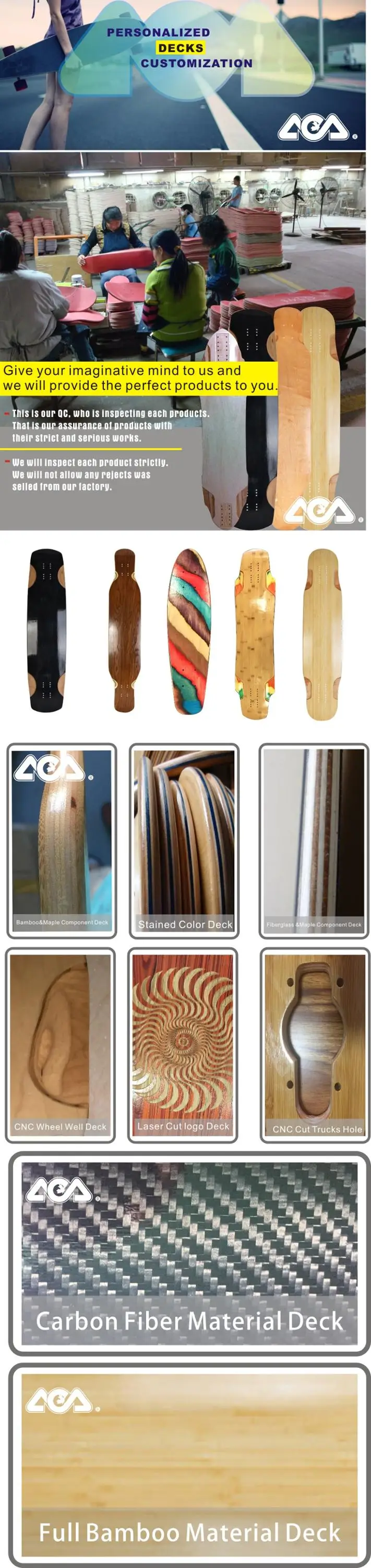 Aca Boards is one of the leading sporting goods products manufacturer in Chinese Mainland, located in China Guangdong city, our goods are very popular in America, Europe and Southeast Asia etc., and we share very good reputation with our old friends from all over the world. We are specializing in the manufacture and export of all kind of boards, such as:skateboard, longboard, mountain board, Cruiser,Downhill longboard,Completed skateboard,Deck,Trcuks, Wheels all of the accessories.