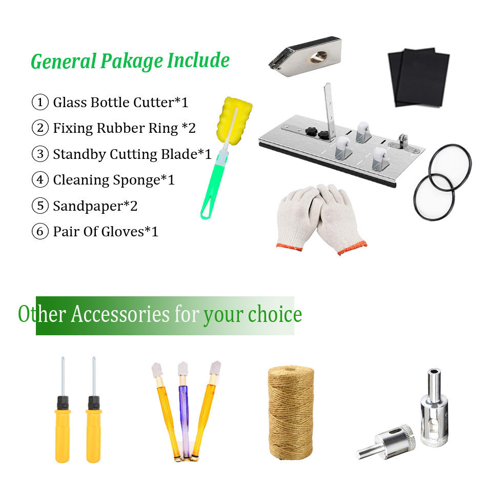 You have more accessories to choose from. Generally, we provide spare cutting blades, glass hole saws, gloves, fixed rubber rings, sandpaper, cleaning sponges, hemp rope, pencil glass cutters, screwdrivers, and manuals. or other accessories you need.