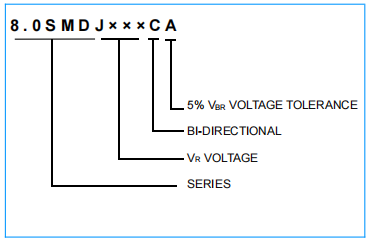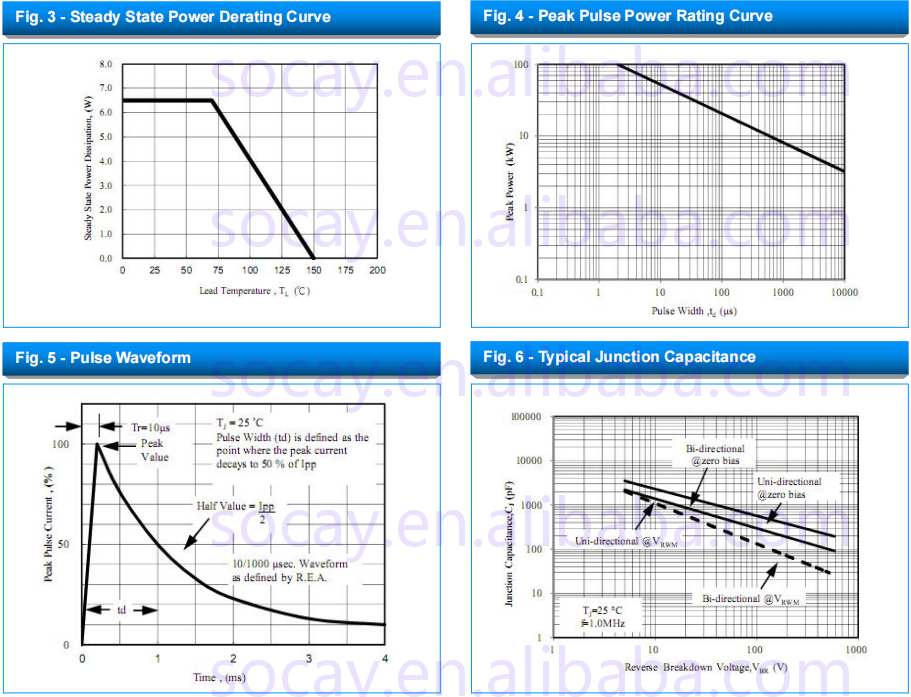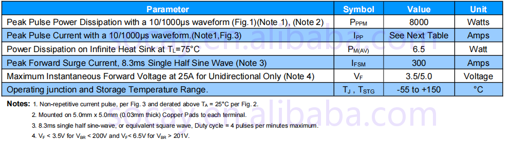 feature | Glass passivation chip Low leakage One-way and two-way units Excellent clamping ability 8000W peak power capability at 10×1000µs waveform Repetition rate (duty cycle): 0.01% Extremely fast response time RoHS Compliant |