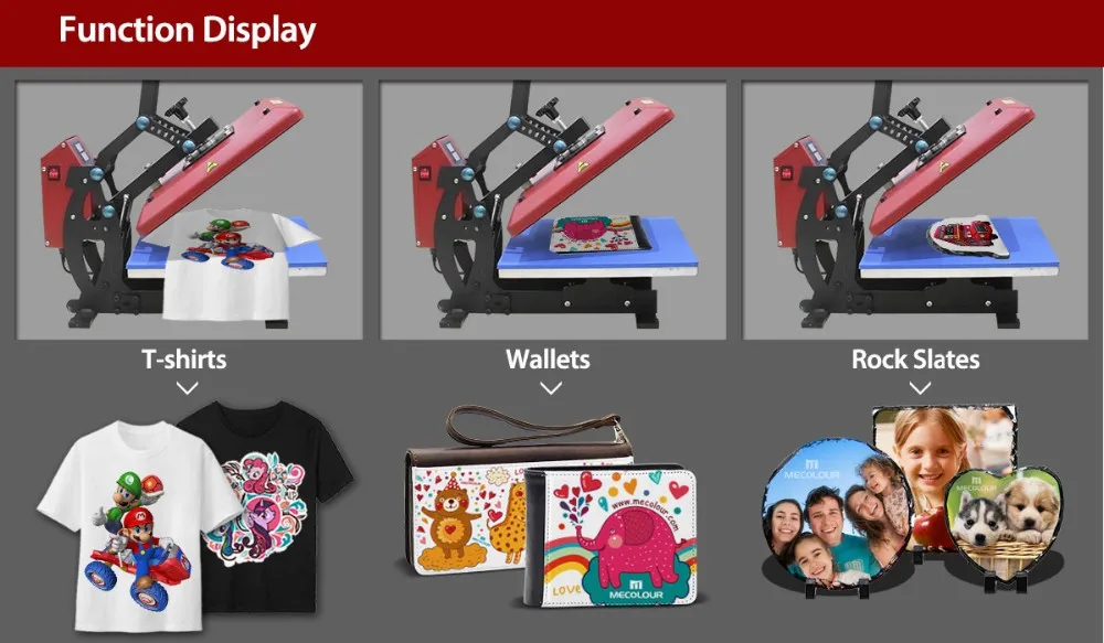 The heat press is a machine designed to imprint a design or graphic on fabric, such as T-shirts,cap,plate,etc