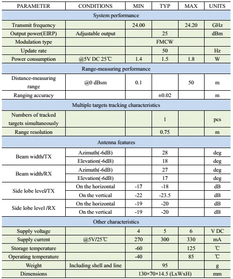 | Beam width/TX in Elevation: | 18°; | Radar Feature: | FMCW K-band radar; |