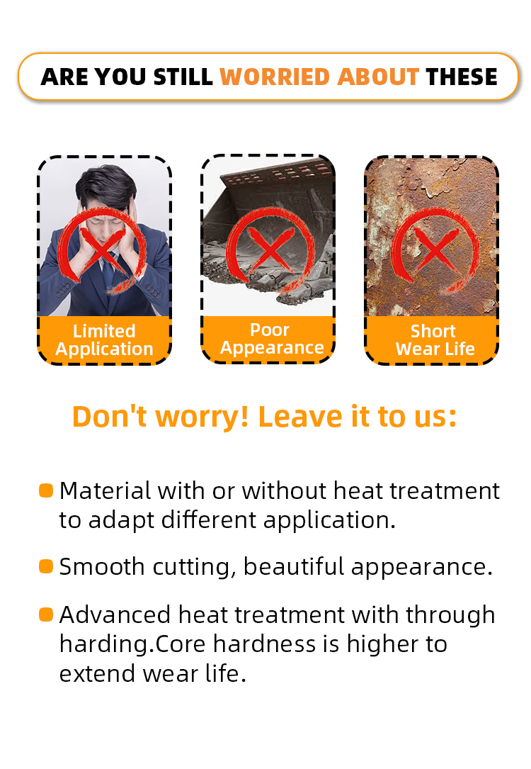 We have different kinds of tips and our products cover many brands such asCaterpillar, Komatsu, Hitachi, Doosan, Hyundai, Daewoo, ZAXIS, JCB, TEREX, CASE, VOLVO, KOBELCO, ESCO, SANY, LGetc... The HRC is 48-52 and the impact is 18-23. We use different chemical composition for different weights to ensure quality. | ||||||||