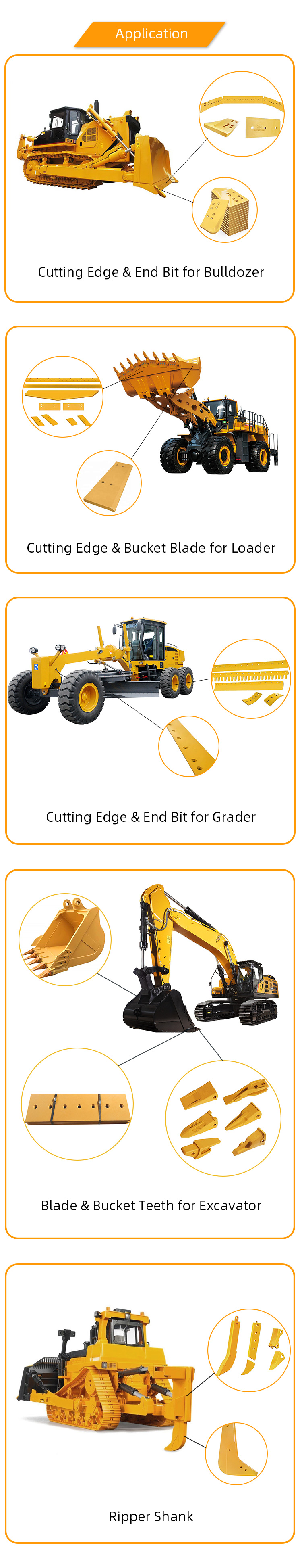 Main business | engineMotor Grader Bladesandend bit, bulldozercutting edge, loaderbucket edge, excavator cutting edge, scraper cutting edge,bucket tooth,Ripper handle, bolts and nuts, pins and retainers | |||||||