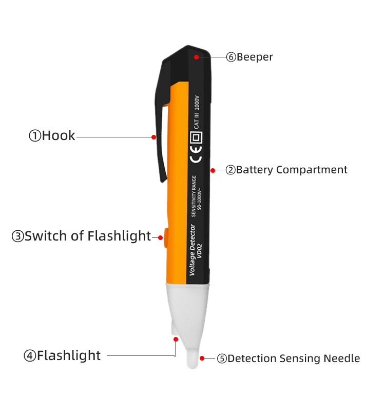 4. When the tester is close to the electric field, the red LED will flash and the buzzer will alarm, the higher the