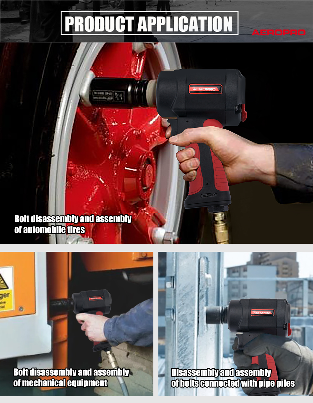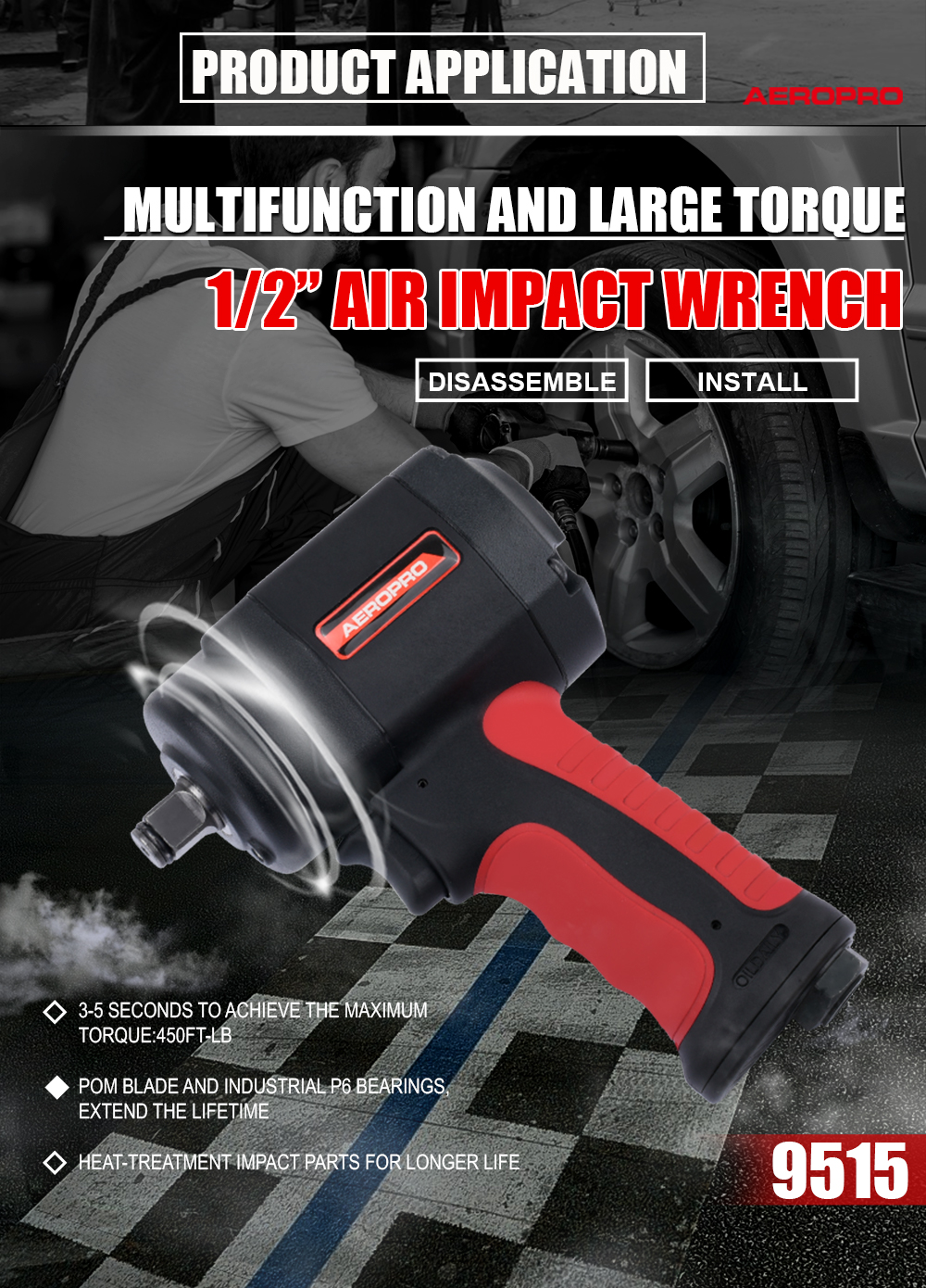 The Aeropro RP9515 Impact Wrench tackles heavy-duty assembly and disassembly applications, suspension work, and industrial equipment repairs with superior performance and control; delivering torque output up to 540 ft-lbs (730 Nm).