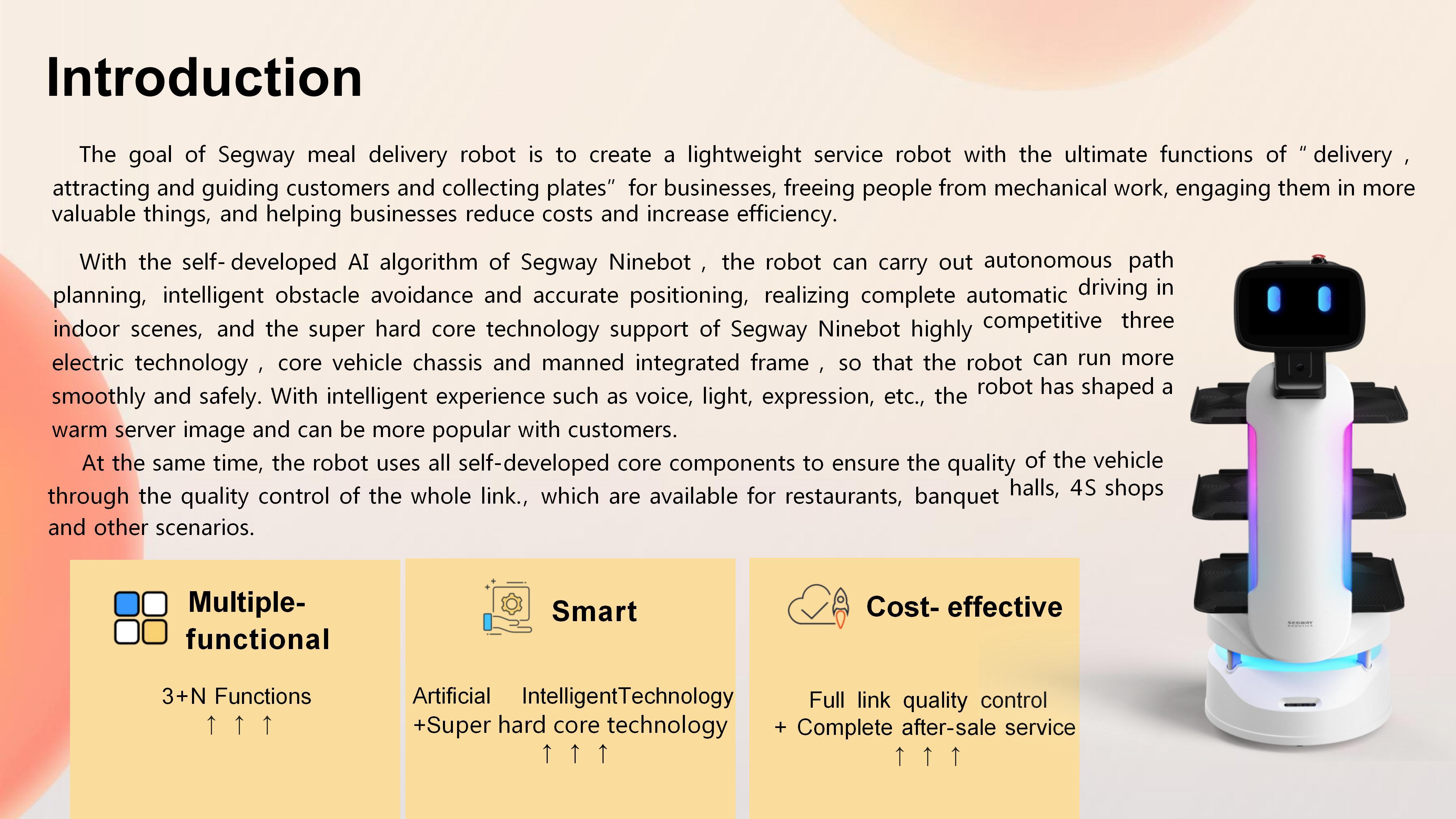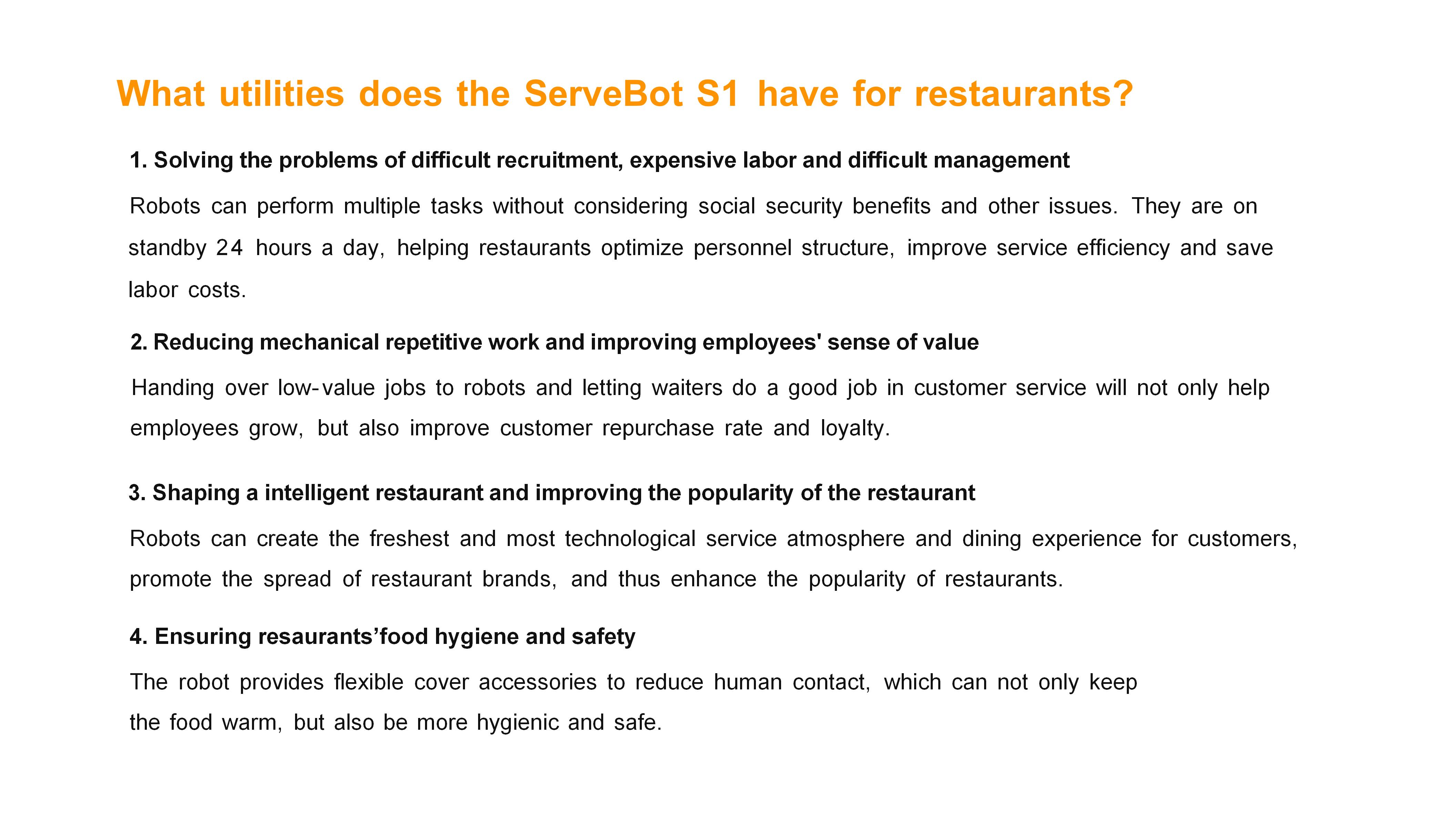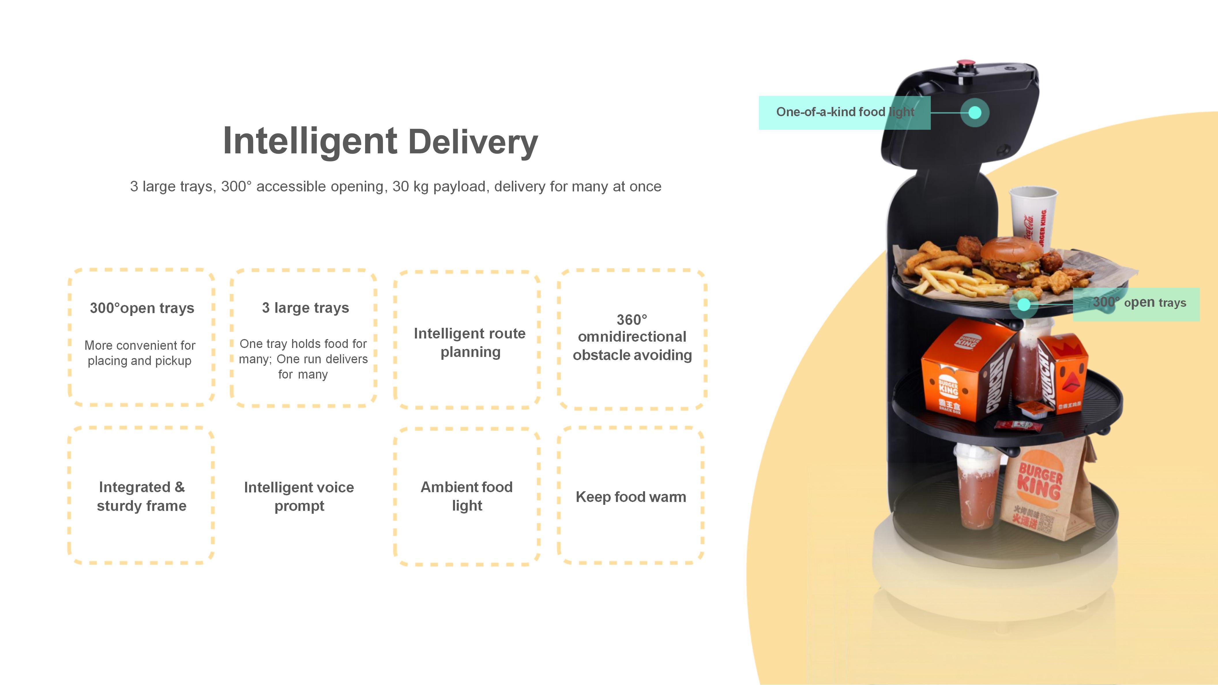 FAQ1. Solve problems such as difficult recruitment, expensive labor, and difficult management. Robots can perform multiple tasks without considering issues such as social security benefits. They are on call 24 hours a day to help restaurants optimize their personnel structure, improve service efficiency and save labor costs. 2. Reduce mechanical repetitive work and improve employees' sense of value. Giving low-value work to robots and allowing waiters to do a good job in customer service will not only help employees grow, but also increase customer repurchase rate and loyalty. 3. Create smart restaurants and increase restaurant popularity. Robots can create the freshest and most technological service atmosphere and dining experience for customers, promote restaurant brand communication, and thus increase restaurant popularity. 4. Ensure food hygiene and safety in restaurants Robots provide flexible covering accessories to reduce human contact, not only can keep food warm, but also more hygienic and safer. 5. Shipping method According to your needs and quantity, we will transport for you in the safest and most convenient way