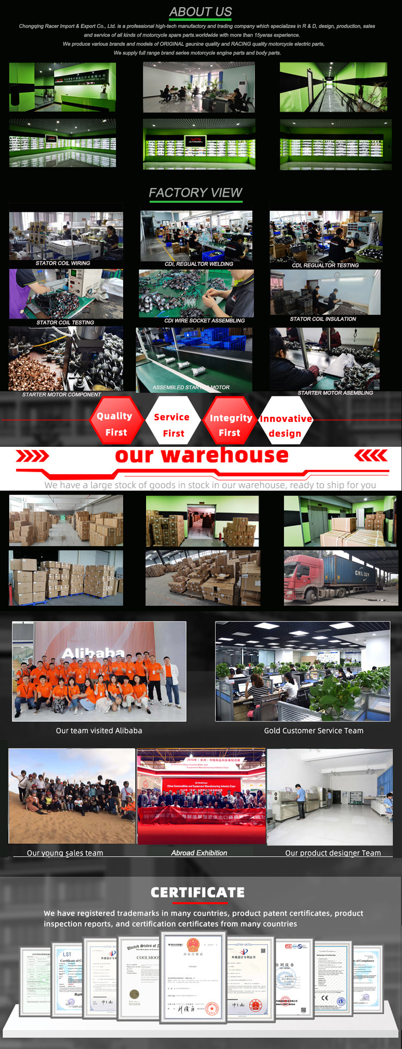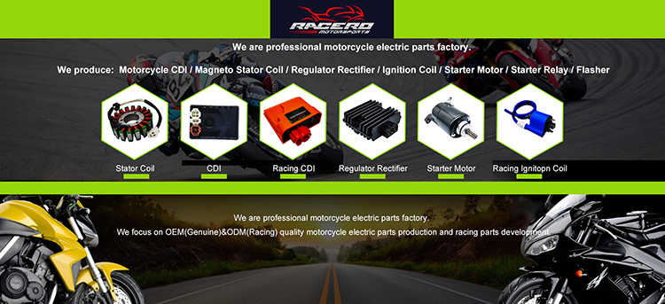 Chongqing Ruisai Import and Export Co., Ltd. is a factory-based integration of industry and tradeProfessional development, production and supply of motorcycle electrical accessories OEMandracing carquality. We produce CDI, Magneto Stator Coil, Regulator Rectifier, Ignition Coil, Starter Motor, Ignition Cap and other products. We have 15 years of production and research experience and are able to customize the standard products you need.