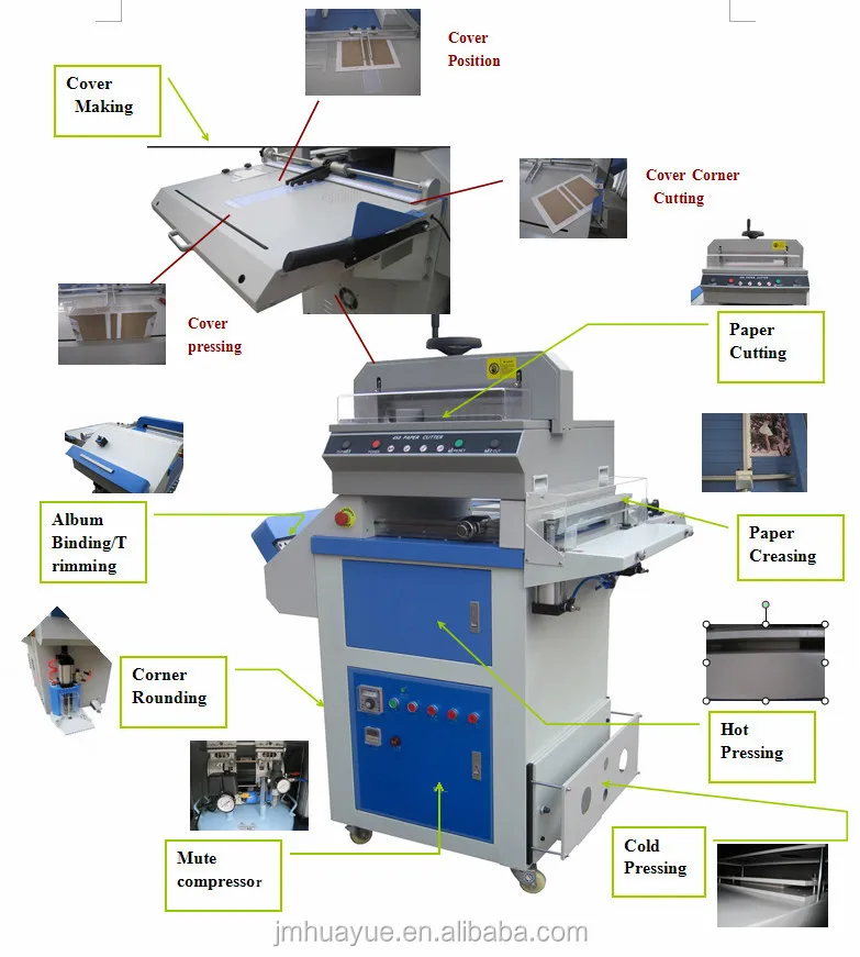 The Popular machine Semi-automatic DIY photo album making machine, photo binding hardcover machine is used for making photo album, menu and more. Multifunctional photo album machine includes 10 functions. Creasing, trimming, hot pressing, cold pressing, corner rounding, cover position, cover creasing, cover corner cutting and Mute oil free compressor. It operates easily and works highly effective.