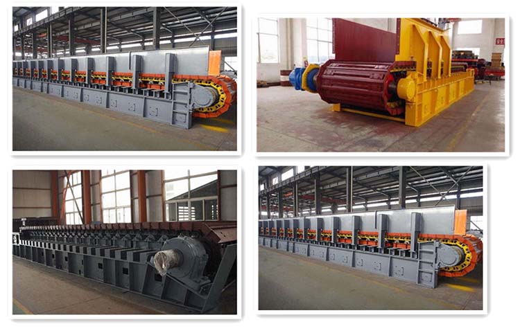 When the apron feeder is working, the motor and the reducer drive the sprocket of the cogged structure to rotate, so that the traction chain meshed with the sprocket drags the material trough to move forward. Supporting device - the traction chain moves on the thrust wheel, supported by the supporting wheel and the conveying trough, and bears the weight of the material and the running device. The material is pushed into the conveying chute from the storage bin above the tail, and then moves to the outlet of the chute with the shell to be discharged.