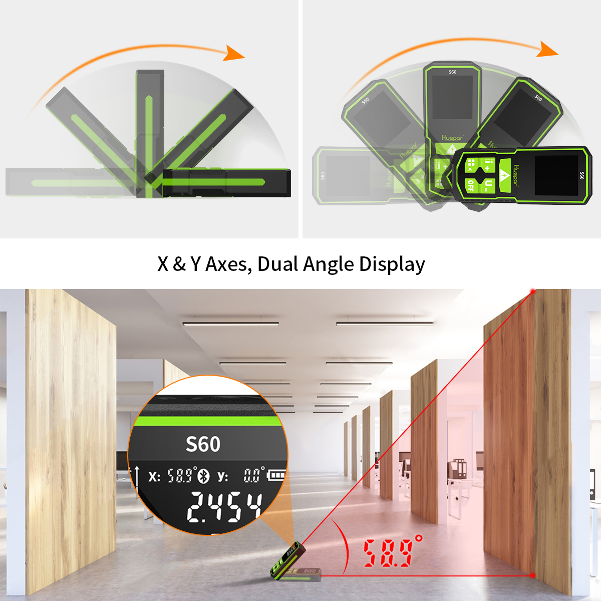Measurement Accuracy: ±1/16" (2mm), Angle Range: ±90°, Working Range: 196Ft/60M, 328Ft/100M, 393Ft/120M