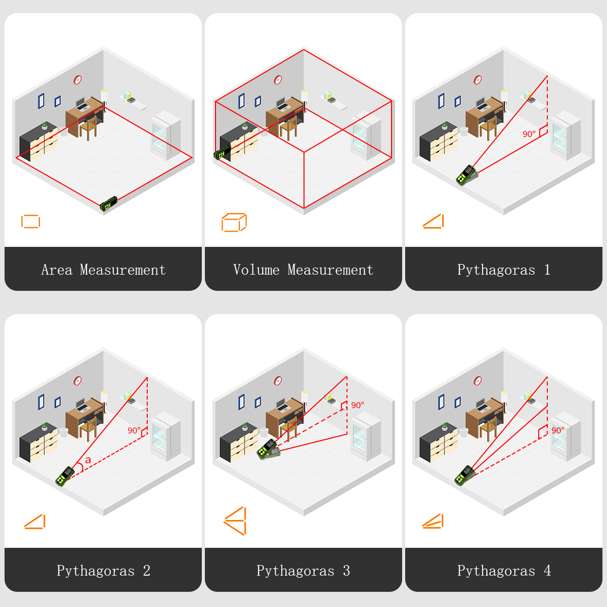 Huepar S120 (S60/S120) laser range finder supports three measurement modes of area, volume and Pythagoras. Distance and Continuous Measurement Methods