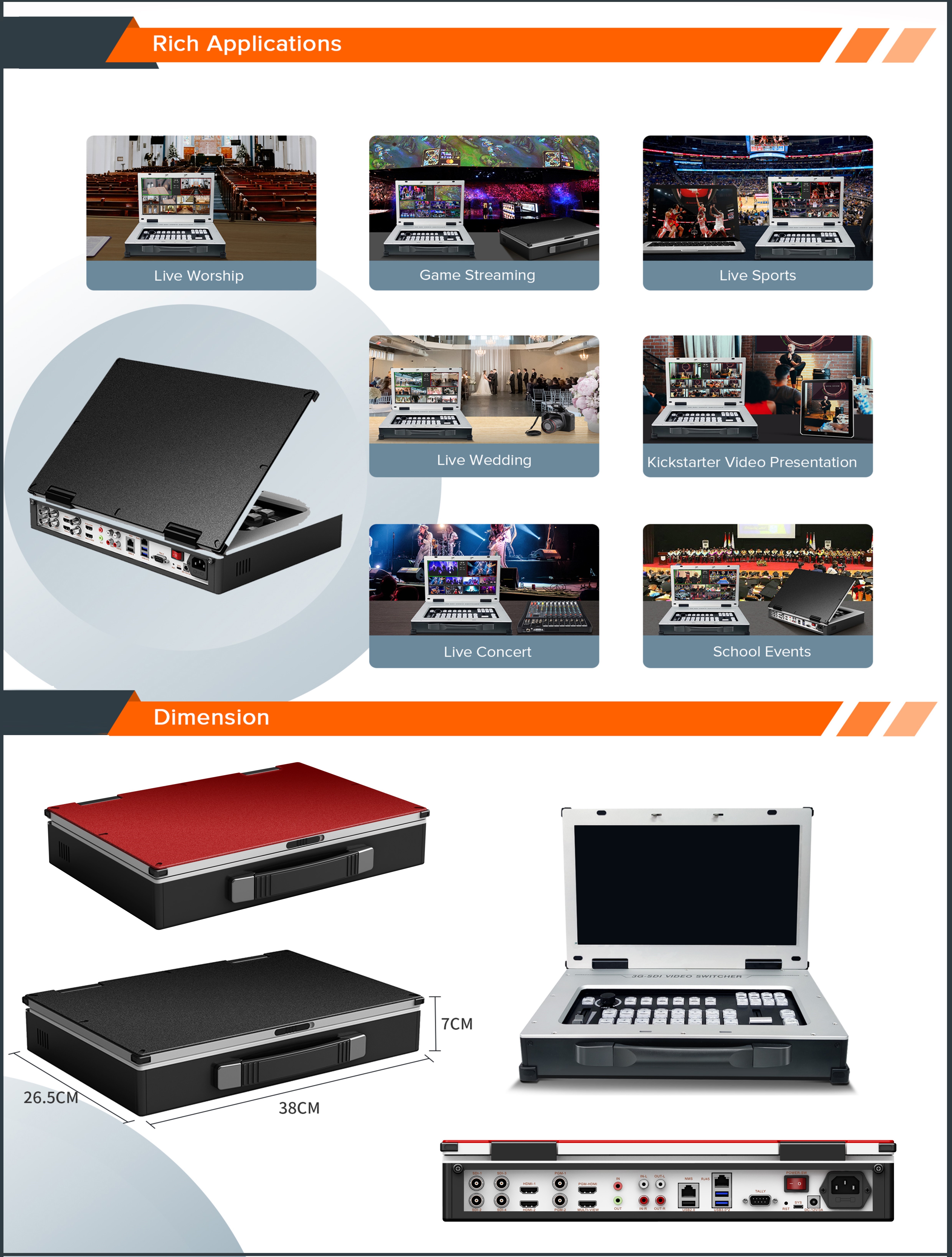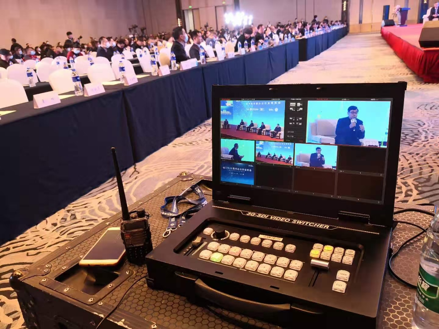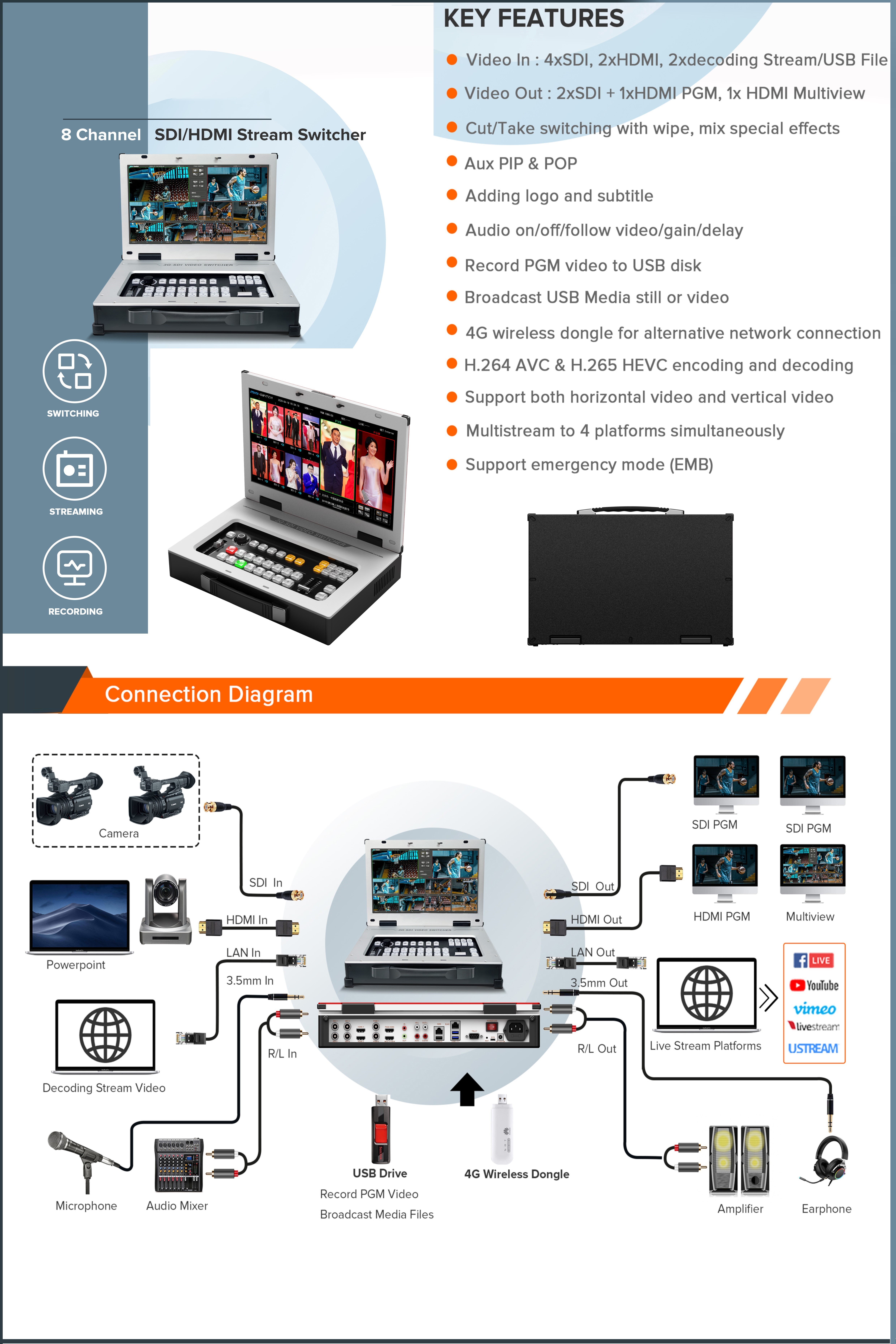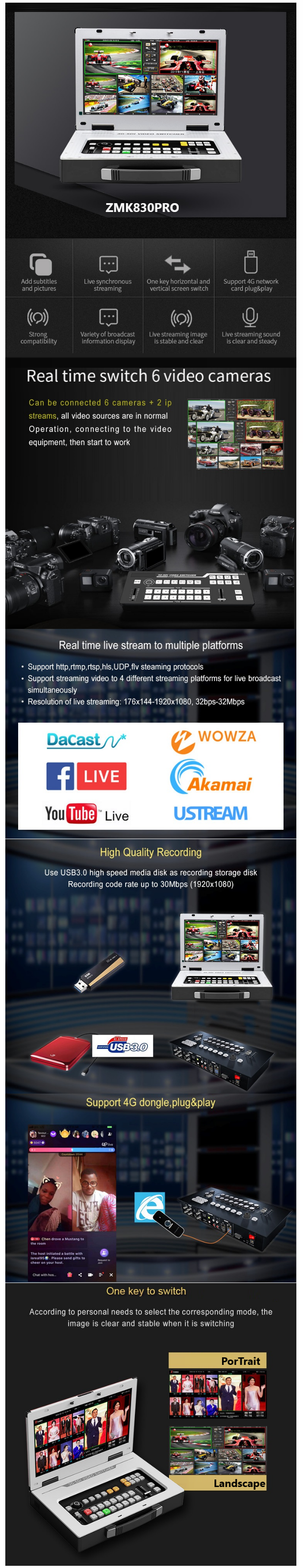 | Video switcher: | 8-way SDI-HD-MI video hybrid switcher | Add logo and subtitle: | support |