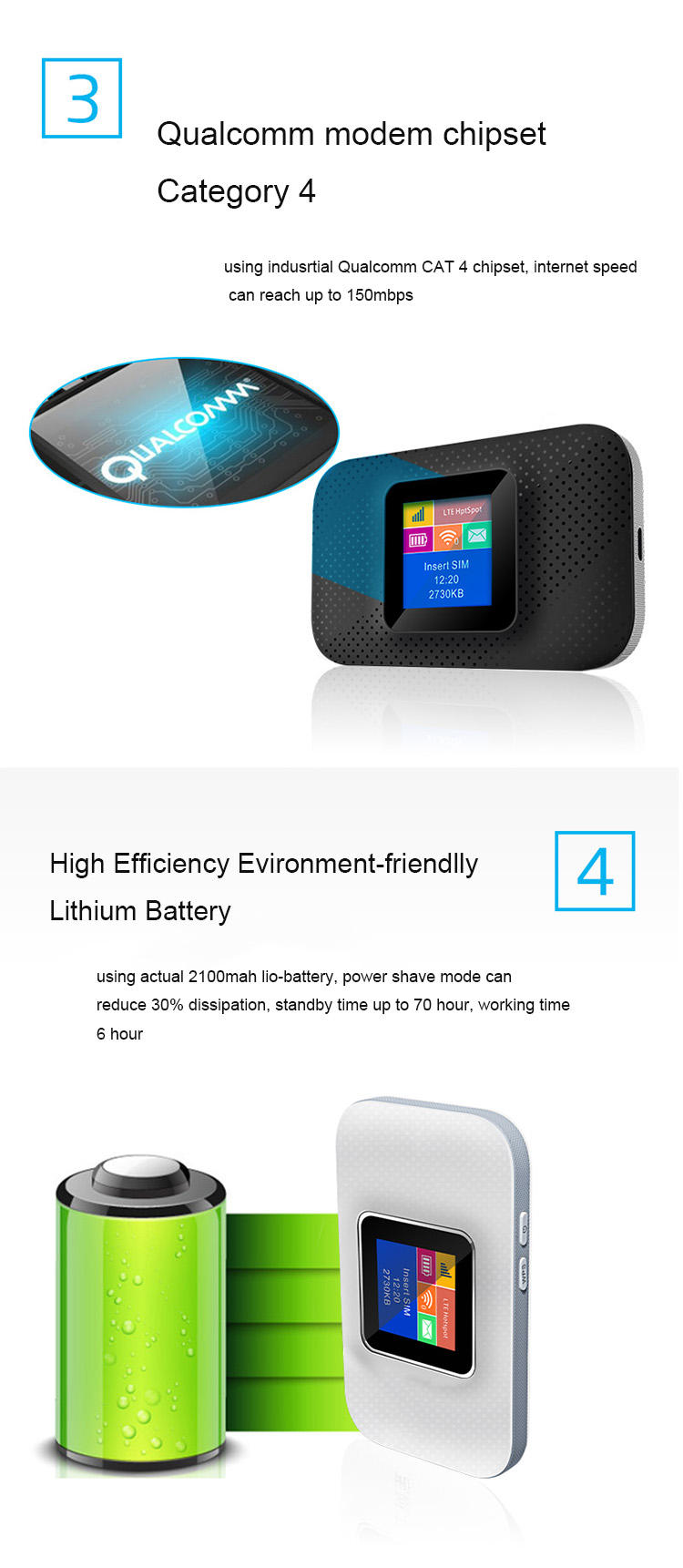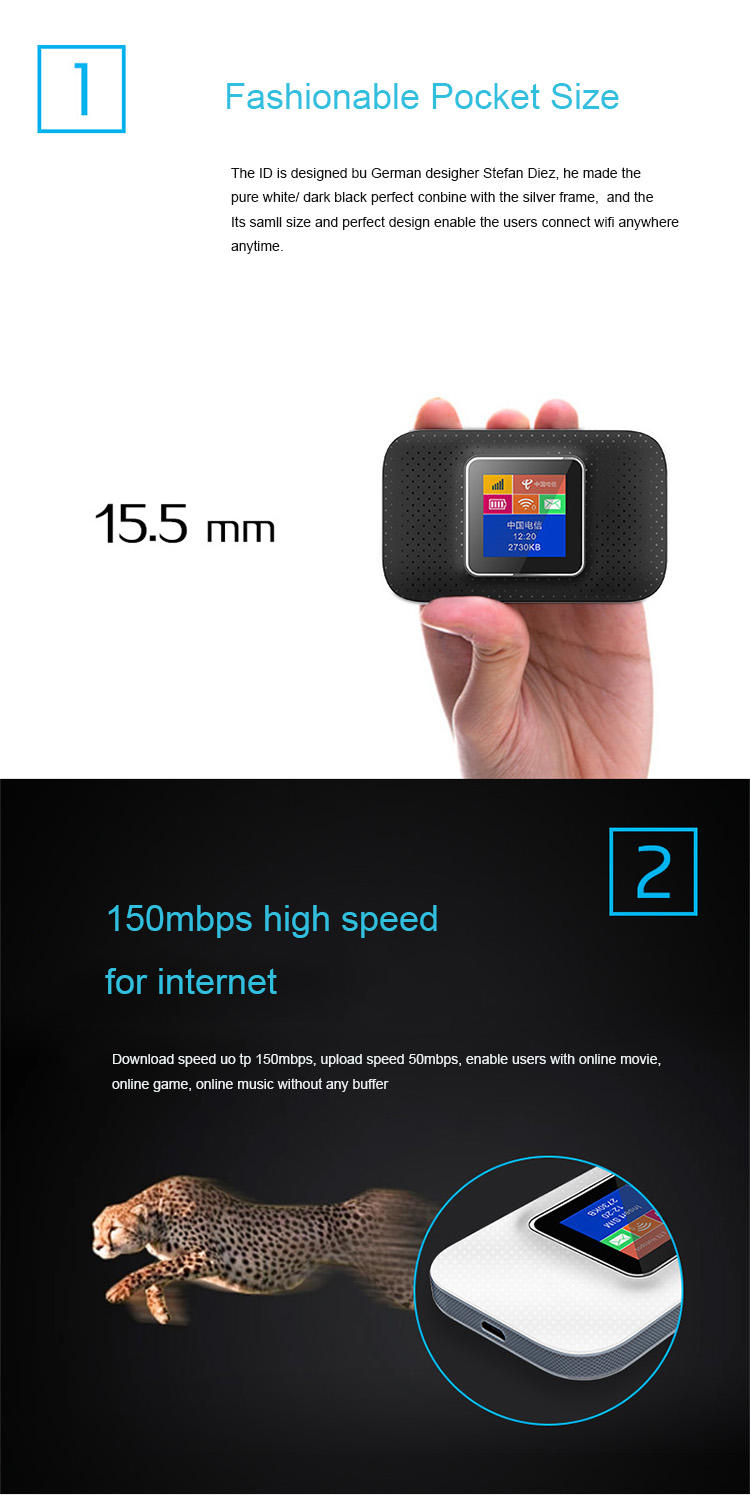 feature: | Transfer speed up to 150Mbps, powerful web surfing Internet connection sharing up to 10 WiFi users Simultaneous surfing without lag Small and light, easy to carry LCD indicator light display, clear at a glance | |