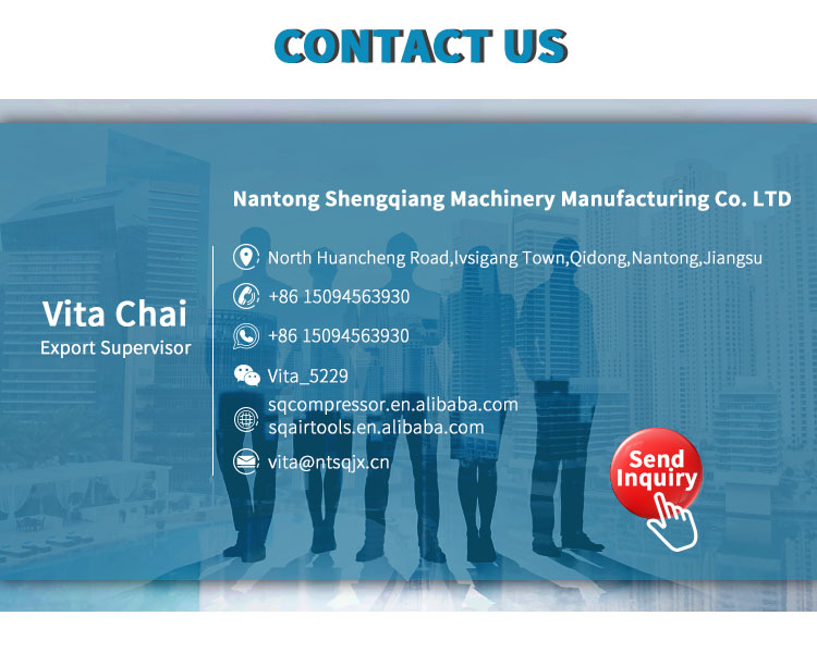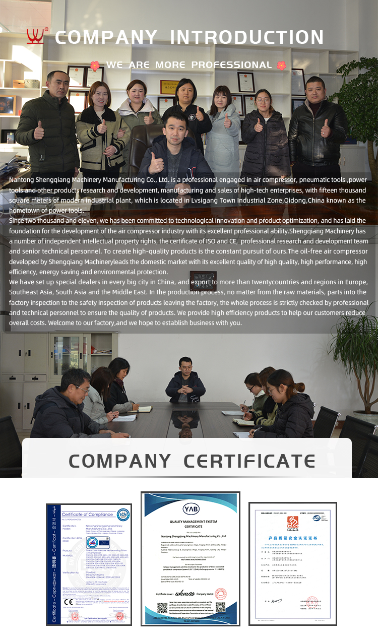 Jiangsu Nantong Shenaiang Machinery Manufacturing Co., Ltd. is one of the backbone enterprises specializing in the manufacture of air compressors in China. Has a first-class industrial production base. The company has a group of professional senior engineers. Senior managers and technicians form a team with a large number of advanced production and testing equipment. Shengqiang company produces various types of air compressors and accessories, and now Shengqiang products enjoy a high reputation in domestic and foreign markets. The company has many dealers in all major and medium cities across the country, and its products are exported to counties in Southeast Asia and Middle East countries, such as India and Iran. Shengqiang keeps innovating in technology and improving its products. , to provide customers with the best products and services.