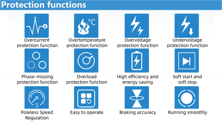 failsafe | Provide overcurrent, overvoltage, undervoltage, overtemperature, phase loss, overload and other protections. | ||||||