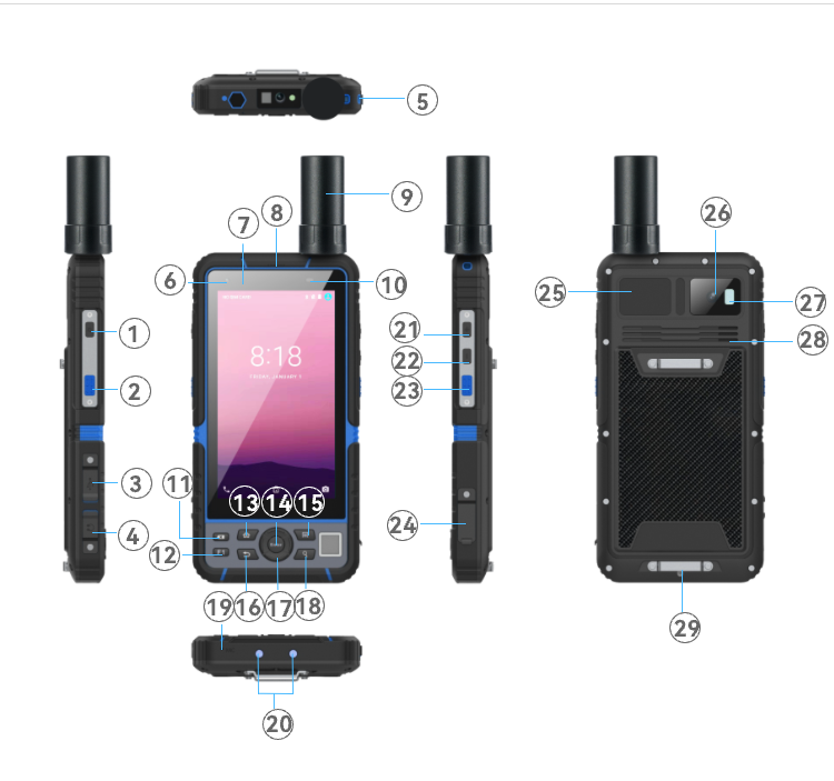 21. Volume up | 22. Lower the volume | 23. Scan Button (Definition) | 24. SIM (sealing cover) | 25. Nameplate |