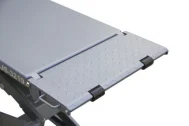Underhung ramps with polymer rollers maximize vehicle spotting footprint. Hinged ramps fold 65 degrees down, Easy for wheel and brake service