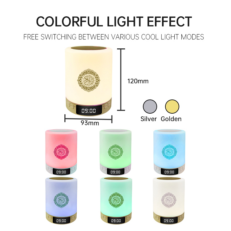 feature | 1. Touch light LED clock Quran speaker with built-in complete Quran 2. Ayah by Ayah, word for word 3. Features: Mobile APP control 4. Accessories: manual, USB data cable, remote control. 5. Support: 18 readers and 14 languages 6.Support.FM, MP3, surah and ayat search 7. 7 kinds of color free transformation and RGB mode 8. 3W HD speaker 9. Warranty period: 1 year |