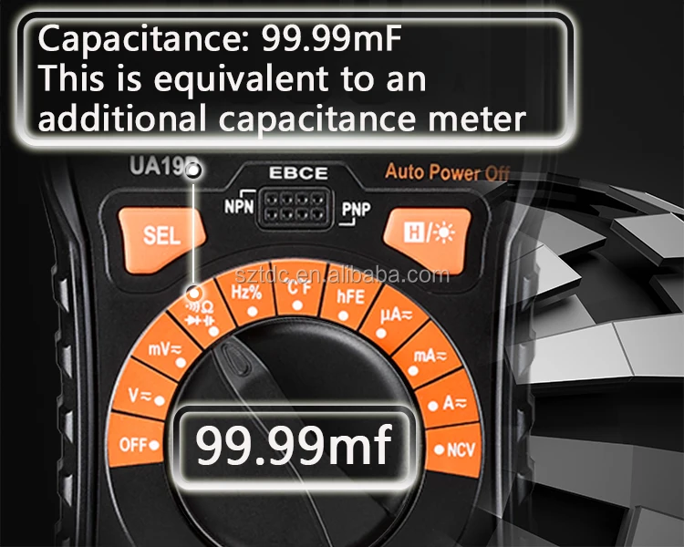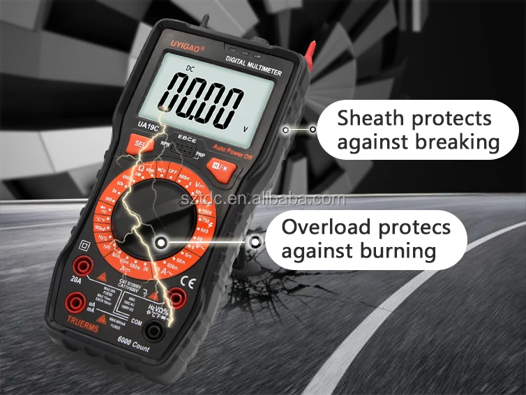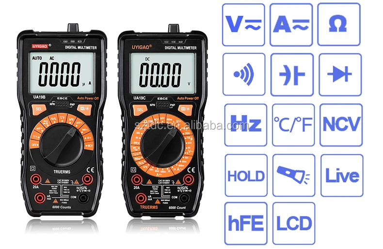 | UA19C | Multimeter with CAT III 1000V ,20A,NCV and True RMS with Manual range 6000 counts; DV1000V ; AC 750V;Capacitamce ;Temperature; Diode Test ;Transistor test ;Circuit On/Off Test ;Duty Ratio ;Frequency; Backlight ;Data hold |