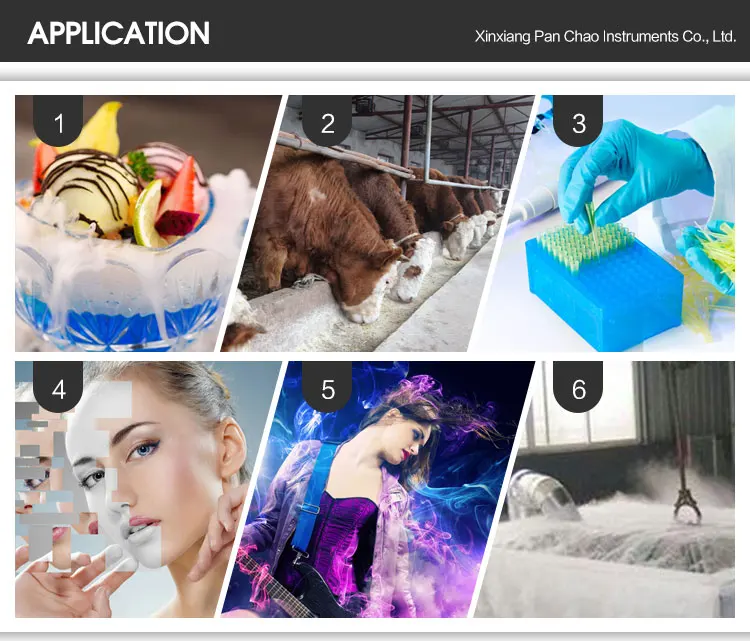 Application 1. Molecular cuisine: molecular food, liquid nitrogen ice cream; 2. Animal husbandry industry: preservation of frozen semen, vaccines, etc .; multi-layer vacuum design, save longer. 3. Medical research: cells, tissues, strains of bacteria and other precious biological samples preserved. 4. Beauty industry: point nevus, freckle, etc., recommended under the guidance of professional treatment. 5. The stage effects: wedding, party, theater, film and television and other celebrations sea of clouds, smoke stage effects production. 6. Cryogenic treatment: cutting edge, mechanical parts, precision parts and other deep cold processing.