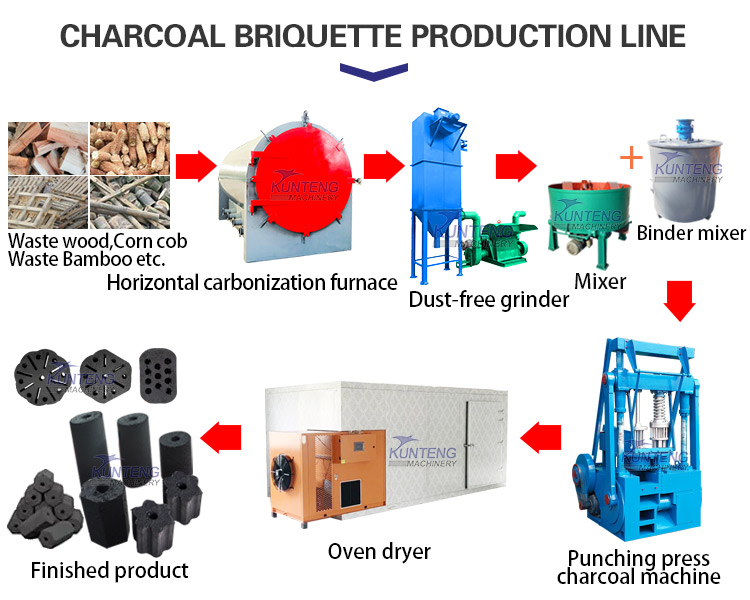 Finally, the charcoal powder is shaped into spherical, cylindrical, table-shaped, and cube-shaped by the molding machine, and then enters the dryer for drying.